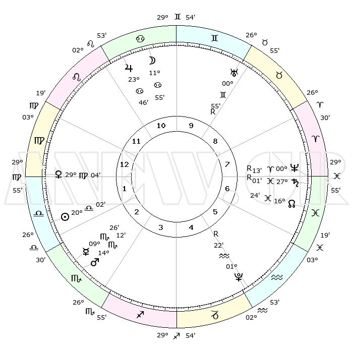 | ΘΕΣΕΙΣ ΠΛΑΝΗΤΩΝ ΑΣΤΡΟΛΟΓΙΚΟΥ ΧΑΡΤΗ ΤΗΣ ΣΤΙΓΜΗΣ ΑΥΤΗΣ | | Πλανήτης | Ζώδιο | Μοίρες | Δεκαήμ. | Σε οίκο | Απόκλιση | | Ακμές των οίκων | Ηλιος | Ζυγός | 19°56' | Δεύτερο | 2 | 07 S 47 | | 1ος | 28°08' | Λέων | Σελήνη | Καρκίνος | 10°24' | Δεύτερο | 11 | 27 N 50 | | 2ος | 21°47' | Παρθένος | Ερμής | Σκορπιός | 09°17' | Πρώτο | 3 | 16 S 01 | | 3ος | 20°17' | Ζυγός | Αφροδίτη | Παρθένος | 28°56' | Τρίτο | 2 | 01 N 48 | | 4ος | 23°11' | Σκορπιός | Αρης | Σκορπιός | 14°08' | Δεύτερο | 3 | 16 S 16 | | 5ος | 27°30' | Τοξότης | Δίας | Καρκίνος | 23°45' | Τρίτο | 11 | 21 N 23 | | 6ος | 29°36' | Αιγόκερως | Κρόνος | Ιχθείς | 27°01'R | Τρίτο | 8 | 03 S 29 | | 7ος | 28°08' | Υδροχόος | Ουρανός | Δίδυμοι | 00°55'R | Πρώτο | 10 | 20 N 08 | | 8ος | 21°47' | Ιχθείς | Ποσειδώνας | Κριός | 00°14'R | Πρώτο | 8 | 01 S 10 | | 9ος | 20°17' | Κριός | Πλούτωνας | Υδροχόος | 01°22'R | Πρώτο | 6 | 23 S 32 | | 10ος | 23°11' | Ταύρος | Β. Δεσμός | Ιχθείς | 16°24' | Δεύτερο | 7 | 05 S 22 | | 11ος | 27°30' | Δίδυμοι | Ωροσκόπος | Λέων | 28°08' | Τρίτο | | | 12ος | 29°36' | Καρκίνος | Μεσουράνημα | Ταύρος | 23°11' | Τρίτο | | | |
