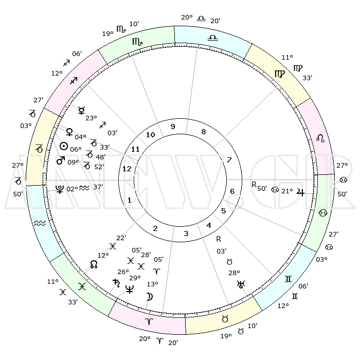 | | ΘΕΣΕΙΣ ΠΛΑΝΗΤΩΝ ΑΣΤΡΟΛΟΓΙΚΟΥ ΧΑΡΤΗ ΤΗΣ ΣΤΙΓΜΗΣ ΑΥΤΗΣ | | | | Πλανήτης | Ζώδιο | Μοίρες | Δεκαήμ. | Σε οίκο | Απόκλιση | | Ακμές των οίκων | | Ηλιος | Αιγόκερως | 06°43' | Πρώτο | 1 | 23 S 16 | | 1ος | 29°55' | Τοξότης | | Σελήνη | Κριός | 12°02' | Δεύτερο | 3 | 07 N 09 | | 2ος | 07°03' | Υδροχόος | | Ερμής | Τοξότης | 22°56' | Τρίτο | 12 | 23 S 23 | | 3ος | 17°02' | Ιχθείς | | Αφροδίτη | Αιγόκερως | 04°28' | Πρώτο | 1 | 23 S 43 | | 4ος | 20°60' | Κριός | | Αρης | Αιγόκερως | 09°48' | Πρώτο | 1 | 23 S 56 | | 5ος | 17°19' | Ταύρος | | Δίας | Καρκίνος | 21°50'R | Τρίτο | 7 | 21 N 53 | | 6ος | 09°08' | Δίδυμοι | | Κρόνος | Ιχθείς | 26°05' | Τρίτο | 3 | 03 S 39 | | 7ος | 29°55' | Δίδυμοι | | Ουρανός | Ταύρος | 28°03'R | Τρίτο | 5 | 19 N 32 | | 8ος | 07°03' | Λέων | | Ποσειδώνας | Ιχθείς | 29°28' | Τρίτο | 3 | 01 S 26 | | 9ος | 17°02' | Παρθένος | | Πλούτωνας | Υδροχόος | 02°37' | Πρώτο | 1 | 23 S 15 | | 10ος | 20°60' | Ζυγός | | Β. Δεσμός | Ιχθείς | 12°22' | Δεύτερο | 2 | 06 S 55 | | 11ος | 17°19' | Σκορπιός | | Ωροσκόπος | Τοξότης | 29°55' | Τρίτο | | | 12ος | 09°08' | Τοξότης | | Μεσουράνημα | Ζυγός | 20°60' | Τρίτο | | | |