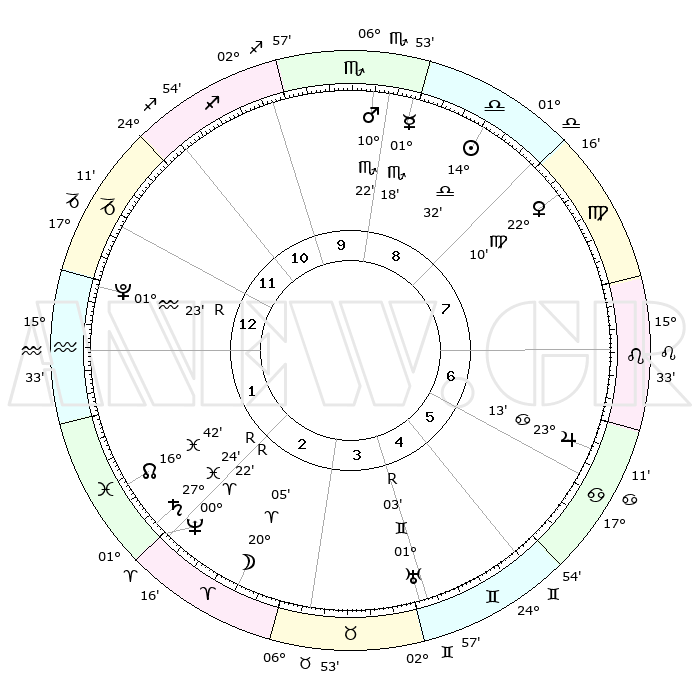| ΘΕΣΕΙΣ ΠΛΑΝΗΤΩΝ ΑΣΤΡΟΛΟΓΙΚΟΥ ΧΑΡΤΗ ΤΗΣ ΣΤΙΓΜΗΣ ΑΥΤΗΣ | | Πλανήτης | Ζώδιο | Μοίρες | Δεκαήμ. | Σε οίκο | Απόκλιση | | Ακμές των οίκων | Ηλιος | Ζυγός | 14°27' | Δεύτερο | 9 | 05 S 42 | | 1ος | 11°49' | Αιγόκερως | Σελήνη | Κριός | 18°52' | Δεύτερο | 3 | 09 N 51 | | 2ος | 21°59' | Υδροχόος | Ερμής | Σκορπιός | 01°11' | Πρώτο | 9 | 12 S 42 | | 3ος | 02°14' | Κριός | Αφροδίτη | Παρθένος | 22°04' | Τρίτο | 8 | 04 N 27 | | 4ος | 04°05' | Ταύρος | Αρης | Σκορπιός | 10°18' | Δεύτερο | 10 | 15 S 03 | | 5ος | 28°41' | Ταύρος | Δίας | Καρκίνος | 23°12' | Τρίτο | 7 | 21 N 28 | | 6ος | 19°58' | Δίδυμοι | Κρόνος | Ιχθείς | 27°24'R | Τρίτο | 2 | 03 S 20 | | 7ος | 11°49' | Καρκίνος | Ουρανός | Δίδυμοι | 01°04'R | Πρώτο | 5 | 20 N 10 | | 8ος | 21°59' | Λέων | Ποσειδώνας | Κριός | 00°22'R | Πρώτο | 2 | 01 S 07 | | 9ος | 02°14' | Ζυγός | Πλούτωνας | Υδροχόος | 01°23'R | Πρώτο | 1 | 23 S 32 | | 10ος | 04°05' | Σκορπιός | Β. Δεσμός | Ιχθείς | 16°42' | Δεύτερο | 2 | 05 S 15 | | 11ος | 28°41' | Σκορπιός | Ωροσκόπος | Αιγόκερως | 11°49' | Δεύτερο | | | 12ος | 19°58' | Τοξότης | Μεσουράνημα | Σκορπιός | 04°05' | Πρώτο | | | |
