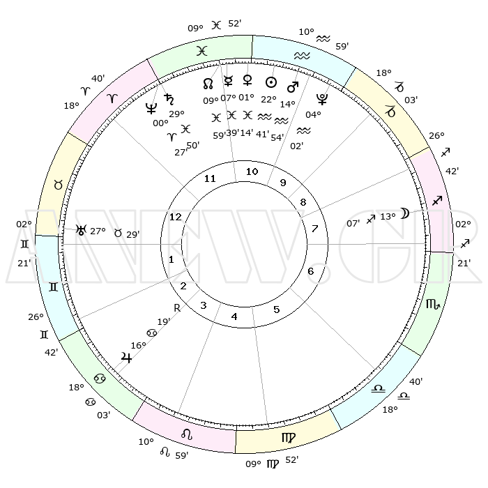 | | ΘΕΣΕΙΣ ΠΛΑΝΗΤΩΝ ΑΣΤΡΟΛΟΓΙΚΟΥ ΧΑΡΤΗ ΤΗΣ ΣΤΙΓΜΗΣ ΑΥΤΗΣ | | | | Πλανήτης | Ζώδιο | Μοίρες | Δεκαήμ. | Σε οίκο | Απόκλιση | | Ακμές των οίκων | | Ηλιος | Υδροχόος | 22°37' | Τρίτο | 11 | 13 S 58 | | 1ος | 29°33' | Κριός | | Σελήνη | Τοξότης | 12°18' | Δεύτερο | 8 | 27 S 28 | | 2ος | 01°53' | Δίδυμοι | | Ερμής | Ιχθείς | 07°33' | Πρώτο | 11 | 09 S 22 | | 3ος | 25°30' | Δίδυμοι | | Αφροδίτη | Ιχθείς | 01°09' | Πρώτο | 11 | 12 S 26 | | 4ος | 17°11' | Καρκίνος | | Αρης | Υδροχόος | 14°51' | Δεύτερο | 11 | 17 S 24 | | 5ος | 11°32' | Λέων | | Δίας | Καρκίνος | 16°20'R | Δεύτερο | 3 | 22 N 45 | | 6ος | 14°10' | Παρθένος | | Κρόνος | Ιχθείς | 29°49' | Τρίτο | 12 | 02 S 03 | | 7ος | 29°33' | Ζυγός | | Ουρανός | Ταύρος | 27°29' | Τρίτο | 1 | 19 N 25 | | 8ος | 01°53' | Τοξότης | | Ποσειδώνας | Κριός | 00°27' | Πρώτο | 12 | 01 S 01 | | 9ος | 25°30' | Τοξότης | | Πλούτωνας | Υδροχόος | 04°01' | Πρώτο | 10 | 22 S 58 | | 10ος | 17°11' | Αιγόκερως | | Β. Δεσμός | Ιχθείς | 09°59' | Πρώτο | 11 | 07 S 50 | | 11ος | 11°32' | Υδροχόος | | Ωροσκόπος | Κριός | 29°33' | Τρίτο | | | 12ος | 14°10' | Ιχθείς | | Μεσουράνημα | Αιγόκερως | 17°11' | Δεύτερο | | | |