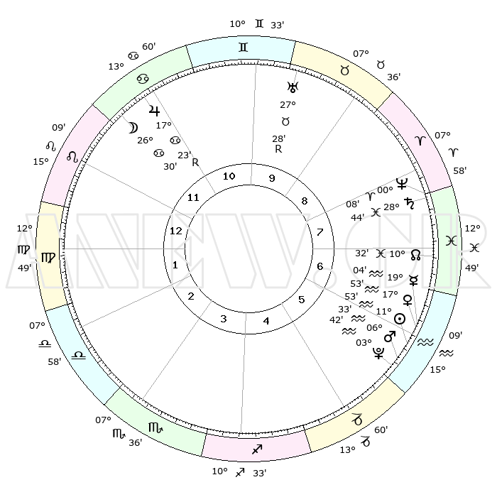 | | ΘΕΣΕΙΣ ΠΛΑΝΗΤΩΝ ΑΣΤΡΟΛΟΓΙΚΟΥ ΧΑΡΤΗ ΤΗΣ ΣΤΙΓΜΗΣ ΑΥΤΗΣ | | | | Πλανήτης | Ζώδιο | Μοίρες | Δεκαήμ. | Σε οίκο | Απόκλιση | | Ακμές των οίκων | | Ηλιος | Υδροχόος | 11°49' | Δεύτερο | 6 | 17 S 14 | | 1ος | 23°35' | Λέων | | Σελήνη | Καρκίνος | 25°32' | Τρίτο | 12 | 24 N 34 | | 2ος | 16°46' | Παρθένος | | Ερμής | Υδροχόος | 18°57' | Δεύτερο | 6 | 16 S 57 | | 3ος | 14°48' | Ζυγός | | Αφροδίτη | Υδροχόος | 17°48' | Δεύτερο | 6 | 16 S 47 | | 4ος | 17°35' | Σκορπιός | | Αρης | Υδροχόος | 06°30' | Πρώτο | 6 | 19 S 39 | | 5ος | 22°14' | Τοξότης | | Δίας | Καρκίνος | 17°23'R | Δεύτερο | 11 | 22 N 36 | | 6ος | 24°46' | Αιγόκερως | | Κρόνος | Ιχθείς | 28°44' | Τρίτο | 8 | 02 S 30 | | 7ος | 23°35' | Υδροχόος | | Ουρανός | Ταύρος | 27°28'R | Τρίτο | 10 | 19 N 24 | | 8ος | 16°46' | Ιχθείς | | Ποσειδώνας | Κριός | 00°08' | Πρώτο | 8 | 01 S 09 | | 9ος | 14°48' | Κριός | | Πλούτωνας | Υδροχόος | 03°42' | Πρώτο | 6 | 23 S 01 | | 10ος | 17°35' | Ταύρος | | Β. Δεσμός | Ιχθείς | 10°33' | Δεύτερο | 7 | 07 S 37 | | 11ος | 22°14' | Δίδυμοι | | Ωροσκόπος | Λέων | 23°35' | Τρίτο | | | 12ος | 24°46' | Καρκίνος | | Μεσουράνημα | Ταύρος | 17°35' | Δεύτερο | | | |