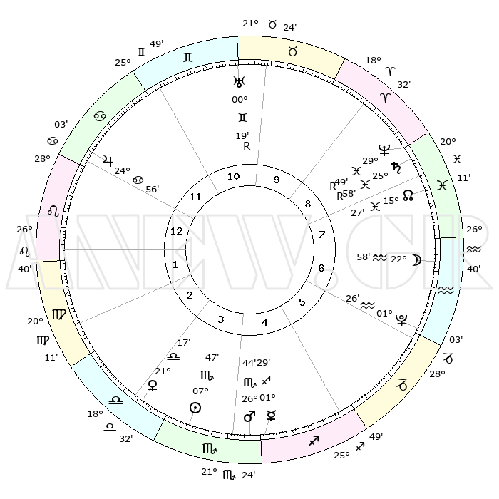 | | ΘΕΣΕΙΣ ΠΛΑΝΗΤΩΝ ΑΣΤΡΟΛΟΓΙΚΟΥ ΧΑΡΤΗ ΤΗΣ ΣΤΙΓΜΗΣ ΑΥΤΗΣ | | | | Πλανήτης | Ζώδιο | Μοίρες | Δεκαήμ. | Σε οίκο | Απόκλιση | | Ακμές των οίκων | | Ηλιος | Σκορπιός | 07°37' | Πρώτο | 5 | 14 S 03 | | 1ος | 10°03' | Καρκίνος | | Σελήνη | Υδροχόος | 20°54' | Τρίτο | 8 | 16 S 40 | | 2ος | 00°29' | Λέων | | Ερμής | Τοξότης | 01°20' | Πρώτο | 5 | 23 S 15 | | 3ος | 23°07' | Λέων | | Αφροδίτη | Ζυγός | 21°05' | Τρίτο | 4 | 06 S 51 | | 4ος | 21°06' | Παρθένος | | Αρης | Σκορπιός | 26°38' | Τρίτο | 5 | 19 S 46 | | 5ος | 26°23' | Ζυγός | | Δίας | Καρκίνος | 24°55' | Τρίτο | 1 | 21 N 13 | | 6ος | 05°19' | Τοξότης | | Κρόνος | Ιχθείς | 25°59'R | Τρίτο | 10 | 03 S 52 | | 7ος | 10°03' | Αιγόκερως | | Ουρανός | Δίδυμοι | 00°19'R | Πρώτο | 11 | 20 N 00 | | 8ος | 00°29' | Υδροχόος | | Ποσειδώνας | Ιχθείς | 29°49'R | Τρίτο | 10 | 01 S 20 | | 9ος | 23°07' | Υδροχόος | | Πλούτωνας | Υδροχόος | 01°26' | Πρώτο | 8 | 23 S 31 | | 10ος | 21°06' | Ιχθείς | | Β. Δεσμός | Ιχθείς | 15°28' | Δεύτερο | 9 | 05 S 44 | | 11ος | 26°23' | Κριός | | Ωροσκόπος | Καρκίνος | 10°03' | Δεύτερο | | | 12ος | 05°19' | Δίδυμοι | | Μεσουράνημα | Ιχθείς | 21°06' | Τρίτο | | | |