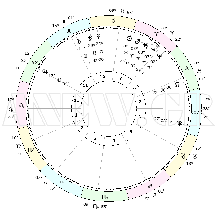 | | ΘΕΣΕΙΣ ΠΛΑΝΗΤΩΝ ΑΣΤΡΟΛΟΓΙΚΟΥ ΧΑΡΤΗ ΤΗΣ ΣΤΙΓΜΗΣ ΑΥΤΗΣ | | | | Πλανήτης | Ζώδιο | Μοίρες | Δεκαήμ. | Σε οίκο | Απόκλιση | | Ακμές των οίκων | | Ηλιος | Ταύρος | 00°19' | Πρώτο | 10 | 11 N 35 | | 1ος | 28°06' | Καρκίνος | | Σελήνη | Δίδυμοι | 10°37' | Δεύτερο | 11 | 27 N 04 | | 2ος | 19°01' | Λέων | | Ερμής | Κριός | 07°49' | Πρώτο | 9 | 00 N 42 | | 3ος | 13°49' | Παρθένος | | Αφροδίτη | Ταύρος | 25°25' | Τρίτο | 11 | 19 N 31 | | 4ος | 14°36' | Ζυγός | | Αρης | Κριός | 08°13' | Πρώτο | 9 | 02 N 23 | | 5ος | 20°41' | Σκορπιός | | Δίας | Καρκίνος | 17°33' | Δεύτερο | 12 | 22 N 40 | | 6ος | 26°42' | Τοξότης | | Κρόνος | Κριός | 08°02' | Πρώτο | 9 | 01 N 12 | | 7ος | 28°06' | Αιγόκερως | | Ουρανός | Ταύρος | 29°42' | Τρίτο | 11 | 19 N 55 | | 8ος | 19°01' | Υδροχόος | | Ποσειδώνας | Κριός | 02°55' | Πρώτο | 9 | 00 S 03 | | 9ος | 13°49' | Ιχθείς | | Πλούτωνας | Υδροχόος | 05°27' | Πρώτο | 7 | 22 S 48 | | 10ος | 14°36' | Κριός | | Β. Δεσμός | Ιχθείς | 06°23' | Πρώτο | 8 | 09 S 10 | | 11ος | 20°41' | Ταύρος | | Ωροσκόπος | Καρκίνος | 28°06' | Τρίτο | | | 12ος | 26°42' | Δίδυμοι | | Μεσουράνημα | Κριός | 14°36' | Δεύτερο | | | |