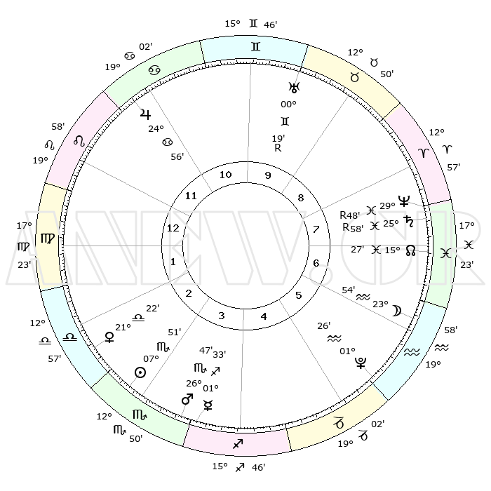 | | ΘΕΣΕΙΣ ΠΛΑΝΗΤΩΝ ΑΣΤΡΟΛΟΓΙΚΟΥ ΧΑΡΤΗ ΤΗΣ ΣΤΙΓΜΗΣ ΑΥΤΗΣ | | | | Πλανήτης | Ζώδιο | Μοίρες | Δεκαήμ. | Σε οίκο | Απόκλιση | | Ακμές των οίκων | | Ηλιος | Σκορπιός | 07°39' | Πρώτο | 4 | 14 S 04 | | 1ος | 20°39' | Καρκίνος | | Σελήνη | Υδροχόος | 21°21' | Τρίτο | 8 | 16 S 30 | | 2ος | 11°12' | Λέων | | Ερμής | Τοξότης | 01°22' | Πρώτο | 5 | 23 S 15 | | 3ος | 05°02' | Παρθένος | | Αφροδίτη | Ζυγός | 21°07' | Τρίτο | 4 | 06 S 52 | | 4ος | 04°44' | Ζυγός | | Αρης | Σκορπιός | 26°39' | Τρίτο | 5 | 19 S 46 | | 5ος | 10°45' | Σκορπιός | | Δίας | Καρκίνος | 24°55' | Τρίτο | 1 | 21 N 13 | | 6ος | 18°02' | Τοξότης | | Κρόνος | Ιχθείς | 25°59'R | Τρίτο | 9 | 03 S 52 | | 7ος | 20°39' | Αιγόκερως | | Ουρανός | Δίδυμοι | 00°19'R | Πρώτο | 11 | 20 N 00 | | 8ος | 11°12' | Υδροχόος | | Ποσειδώνας | Ιχθείς | 29°49'R | Τρίτο | 9 | 01 S 20 | | 9ος | 05°02' | Ιχθείς | | Πλούτωνας | Υδροχόος | 01°26' | Πρώτο | 7 | 23 S 31 | | 10ος | 04°44' | Κριός | | Β. Δεσμός | Ιχθείς | 15°28' | Δεύτερο | 9 | 05 S 44 | | 11ος | 10°45' | Ταύρος | | Ωροσκόπος | Καρκίνος | 20°39' | Τρίτο | | | 12ος | 18°02' | Δίδυμοι | | Μεσουράνημα | Κριός | 04°44' | Πρώτο | | | |
