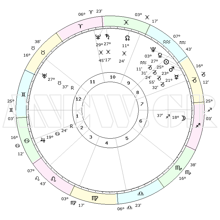 | | ΘΕΣΕΙΣ ΠΛΑΝΗΤΩΝ ΑΣΤΡΟΛΟΓΙΚΟΥ ΧΑΡΤΗ ΤΗΣ ΣΤΙΓΜΗΣ ΑΥΤΗΣ | | | | Πλανήτης | Ζώδιο | Μοίρες | Δεκαήμ. | Σε οίκο | Απόκλιση | | Ακμές των οίκων | | Ηλιος | Αιγόκερως | 25°19' | Τρίτο | 9 | 21 S 04 | | 1ος | 25°45' | Ταύρος | | Σελήνη | Τοξότης | 17°43' | Δεύτερο | 7 | 27 S 55 | | 2ος | 21°27' | Δίδυμοι | | Ερμής | Αιγόκερως | 21°24' | Τρίτο | 9 | 23 S 31 | | 3ος | 13°03' | Καρκίνος | | Αφροδίτη | Αιγόκερως | 27°25' | Τρίτο | 9 | 21 S 39 | | 4ος | 05°31' | Λέων | | Αρης | Αιγόκερως | 23°51' | Τρίτο | 9 | 22 S 17 | | 5ος | 03°16' | Παρθένος | | Δίας | Καρκίνος | 19°25'R | Δεύτερο | 3 | 22 N 18 | | 6ος | 11°01' | Ζυγός | | Κρόνος | Ιχθείς | 27°17' | Τρίτο | 11 | 03 S 07 | | 7ος | 25°45' | Σκορπιός | | Ουρανός | Ταύρος | 27°37'R | Τρίτο | 1 | 19 N 26 | | 8ος | 21°27' | Τοξότης | | Ποσειδώνας | Ιχθείς | 29°45' | Τρίτο | 11 | 01 S 19 | | 9ος | 13°03' | Αιγόκερως | | Πλούτωνας | Υδροχόος | 03°10' | Πρώτο | 9 | 23 S 08 | | 10ος | 05°31' | Υδροχόος | | Β. Δεσμός | Ιχθείς | 11°24' | Δεύτερο | 11 | 07 S 17 | | 11ος | 03°16' | Ιχθείς | | Ωροσκόπος | Ταύρος | 25°45' | Τρίτο | | | 12ος | 11°01' | Κριός | | Μεσουράνημα | Υδροχόος | 05°31' | Πρώτο | | | |