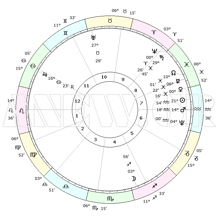 | | ΘΕΣΕΙΣ ΠΛΑΝΗΤΩΝ ΑΣΤΡΟΛΟΓΙΚΟΥ ΧΑΡΤΗ ΤΗΣ ΣΤΙΓΜΗΣ ΑΥΤΗΣ | | | | Πλανήτης | Ζώδιο | Μοίρες | Δεκαήμ. | Σε οίκο | Απόκλιση | | Ακμές των οίκων | | Ηλιος | Υδροχόος | 21°51' | Τρίτο | 8 | 14 S 13 | | 1ος | 00°29' | Λέων | | Σελήνη | Τοξότης | 03°21' | Πρώτο | 5 | 25 S 57 | | 2ος | 21°33' | Λέων | | Ερμής | Ιχθείς | 06°17' | Πρώτο | 8 | 09 S 57 | | 3ος | 16°40' | Παρθένος | | Αφροδίτη | Ιχθείς | 00°13' | Πρώτο | 8 | 12 S 45 | | 4ος | 17°46' | Ζυγός | | Αρης | Υδροχόος | 14°15' | Δεύτερο | 7 | 17 S 34 | | 5ος | 23°48' | Σκορπιός | | Δίας | Καρκίνος | 16°23'R | Δεύτερο | 12 | 22 N 45 | | 6ος | 29°25' | Τοξότης | | Κρόνος | Ιχθείς | 29°45' | Τρίτο | 9 | 02 S 05 | | 7ος | 00°29' | Υδροχόος | | Ουρανός | Ταύρος | 27°29' | Τρίτο | 11 | 19 N 25 | | 8ος | 21°33' | Υδροχόος | | Ποσειδώνας | Κριός | 00°26' | Πρώτο | 9 | 01 S 02 | | 9ος | 16°40' | Ιχθείς | | Πλούτωνας | Υδροχόος | 04°00' | Πρώτο | 7 | 22 S 58 | | 10ος | 17°46' | Κριός | | Β. Δεσμός | Ιχθείς | 10°01' | Δεύτερο | 8 | 07 S 49 | | 11ος | 23°48' | Ταύρος | | Ωροσκόπος | Λέων | 00°29' | Πρώτο | | | 12ος | 29°25' | Δίδυμοι | | Μεσουράνημα | Κριός | 17°46' | Δεύτερο | | | |