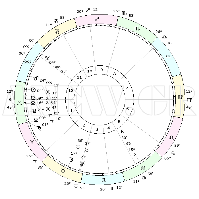| | ΘΕΣΕΙΣ ΠΛΑΝΗΤΩΝ ΑΣΤΡΟΛΟΓΙΚΟΥ ΧΑΡΤΗ ΤΗΣ ΣΤΙΓΜΗΣ ΑΥΤΗΣ | | | | Πλανήτης | Ζώδιο | Μοίρες | Δεκαήμ. | Σε οίκο | Απόκλιση | | Ακμές των οίκων | | Ηλιος | Ιχθείς | 04°32' | Πρώτο | 1 | 09 S 51 | | 1ος | 05°59' | Υδροχόος | | Σελήνη | Ταύρος | 16°36' | Δεύτερο | 3 | 21 N 28 | | 2ος | 20°56' | Ιχθείς | | Ερμής | Ιχθείς | 21°46' | Τρίτο | 2 | 01 S 23 | | 3ος | 28°22' | Κριός | | Αφροδίτη | Ιχθείς | 15°56' | Δεύτερο | 1 | 06 S 52 | | 4ος | 25°51' | Ταύρος | | Αρης | Υδροχόος | 24°09' | Τρίτο | 1 | 14 S 30 | | 5ος | 18°13' | Δίδυμοι | | Δίας | Καρκίνος | 15°30'R | Δεύτερο | 6 | 22 N 52 | | 6ος | 09°54' | Καρκίνος | | Κρόνος | Κριός | 01°09' | Πρώτο | 2 | 01 S 30 | | 7ος | 05°59' | Λέων | | Ουρανός | Ταύρος | 27°37' | Τρίτο | 4 | 19 N 27 | | 8ος | 20°56' | Παρθένος | | Ποσειδώνας | Κριός | 00°51' | Πρώτο | 2 | 00 S 52 | | 9ος | 28°22' | Ζυγός | | Πλούτωνας | Υδροχόος | 04°23' | Πρώτο | 12 | 22 S 54 | | 10ος | 25°51' | Σκορπιός | | Β. Δεσμός | Ιχθείς | 09°21' | Πρώτο | 1 | 08 S 04 | | 11ος | 18°13' | Τοξότης | | Ωροσκόπος | Υδροχόος | 05°59' | Πρώτο | | | 12ος | 09°54' | Αιγόκερως | | Μεσουράνημα | Σκορπιός | 25°51' | Τρίτο | | | |