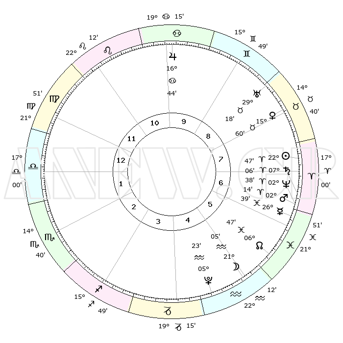 | | ΘΕΣΕΙΣ ΠΛΑΝΗΤΩΝ ΑΣΤΡΟΛΟΓΙΚΟΥ ΧΑΡΤΗ ΤΗΣ ΣΤΙΓΜΗΣ ΑΥΤΗΣ | | | | Πλανήτης | Ζώδιο | Μοίρες | Δεκαήμ. | Σε οίκο | Απόκλιση | | Ακμές των οίκων | | Ηλιος | Κριός | 22°43' | Τρίτο | 8 | 08 N 50 | | 1ος | 25°56' | Παρθένος | | Σελήνη | Υδροχόος | 20°10' | Τρίτο | 5 | 16 S 16 | | 2ος | 22°13' | Ζυγός | | Ερμής | Ιχθείς | 26°33' | Τρίτο | 7 | 03 S 40 | | 3ος | 22°29' | Σκορπιός | | Αφροδίτη | Ταύρος | 15°54' | Δεύτερο | 8 | 16 N 39 | | 4ος | 25°26' | Τοξότης | | Αρης | Κριός | 02°11' | Πρώτο | 7 | 00 S 03 | | 5ος | 28°28' | Αιγόκερως | | Δίας | Καρκίνος | 16°44' | Δεύτερο | 10 | 22 N 46 | | 6ος | 29°04' | Υδροχόος | | Κρόνος | Κριός | 07°06' | Πρώτο | 7 | 00 N 51 | | 7ος | 25°56' | Ιχθείς | | Ουρανός | Ταύρος | 29°18' | Τρίτο | 9 | 19 N 50 | | 8ος | 22°13' | Κριός | | Ποσειδώνας | Κριός | 02°38' | Πρώτο | 7 | 00 S 09 | | 9ος | 22°29' | Ταύρος | | Πλούτωνας | Υδροχόος | 05°23' | Πρώτο | 5 | 22 S 47 | | 10ος | 25°26' | Δίδυμοι | | Β. Δεσμός | Ιχθείς | 06°47' | Πρώτο | 6 | 09 S 01 | | 11ος | 28°28' | Καρκίνος | | Ωροσκόπος | Παρθένος | 25°56' | Τρίτο | | | 12ος | 29°04' | Λέων | | Μεσουράνημα | Δίδυμοι | 25°26' | Τρίτο | | | |
