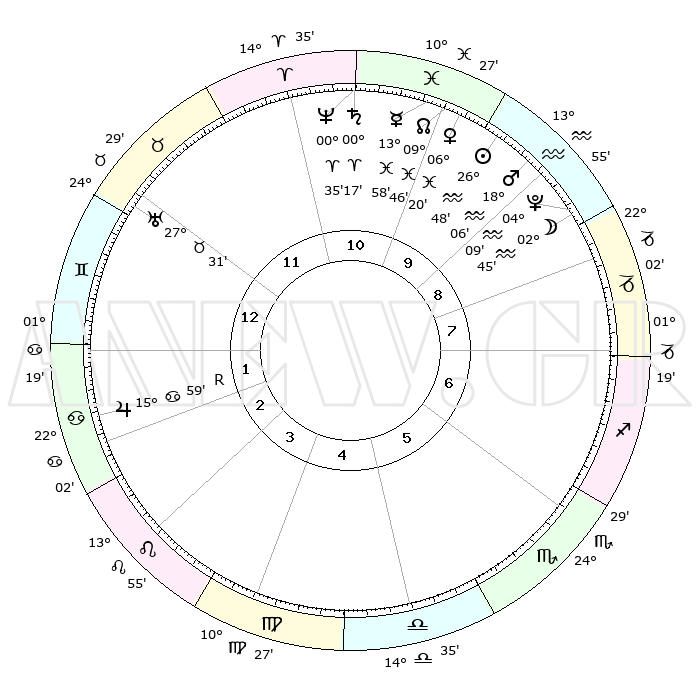 | | ΘΕΣΕΙΣ ΠΛΑΝΗΤΩΝ ΑΣΤΡΟΛΟΓΙΚΟΥ ΧΑΡΤΗ ΤΗΣ ΣΤΙΓΜΗΣ ΑΥΤΗΣ | | | | Πλανήτης | Ζώδιο | Μοίρες | Δεκαήμ. | Σε οίκο | Απόκλιση | | Ακμές των οίκων | | Ηλιος | Υδροχόος | 26°43' | Τρίτο | 10 | 12 S 36 | | 1ος | 04°17' | Δίδυμοι | | Σελήνη | Υδροχόος | 01°49' | Πρώτο | 9 | 22 S 51 | | 2ος | 28°16' | Δίδυμοι | | Ερμής | Ιχθείς | 13°52' | Δεύτερο | 11 | 06 S 13 | | 3ος | 19°34' | Καρκίνος | | Αφροδίτη | Ιχθείς | 06°15' | Πρώτο | 10 | 10 S 35 | | 4ος | 12°40' | Λέων | | Αρης | Υδροχόος | 18°03' | Δεύτερο | 10 | 16 S 27 | | 5ος | 11°53' | Παρθένος | | Δίας | Καρκίνος | 15°60'R | Δεύτερο | 2 | 22 N 48 | | 6ος | 20°57' | Ζυγός | | Κρόνος | Κριός | 00°16' | Πρώτο | 11 | 01 S 52 | | 7ος | 04°17' | Τοξότης | | Ουρανός | Ταύρος | 27°31' | Τρίτο | 12 | 19 N 25 | | 8ος | 28°16' | Τοξότης | | Ποσειδώνας | Κριός | 00°35' | Πρώτο | 11 | 00 S 58 | | 9ος | 19°34' | Αιγόκερως | | Πλούτωνας | Υδροχόος | 04°09' | Πρώτο | 9 | 22 S 56 | | 10ος | 12°40' | Υδροχόος | | Β. Δεσμός | Ιχθείς | 09°46' | Πρώτο | 10 | 07 S 54 | | 11ος | 11°53' | Ιχθείς | | Ωροσκόπος | Δίδυμοι | 04°17' | Πρώτο | | | 12ος | 20°57' | Κριός | | Μεσουράνημα | Υδροχόος | 12°40' | Δεύτερο | | | |