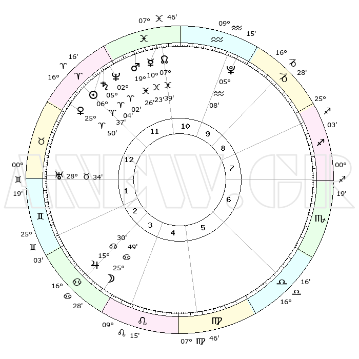 | | ΘΕΣΕΙΣ ΠΛΑΝΗΤΩΝ ΑΣΤΡΟΛΟΓΙΚΟΥ ΧΑΡΤΗ ΤΗΣ ΣΤΙΓΜΗΣ ΑΥΤΗΣ | | | | Πλανήτης | Ζώδιο | Μοίρες | Δεκαήμ. | Σε οίκο | Απόκλιση | | Ακμές των οίκων | | Ηλιος | Κριός | 06°34' | Πρώτο | 12 | 02 N 36 | | 1ος | 02°53' | Ταύρος | | Σελήνη | Καρκίνος | 25°01' | Τρίτο | 4 | 24 N 41 | | 2ος | 04°19' | Δίδυμοι | | Ερμής | Ιχθείς | 10°21' | Δεύτερο | 11 | 08 S 06 | | 3ος | 27°35' | Δίδυμοι | | Αφροδίτη | Κριός | 25°46' | Τρίτο | 12 | 09 N 22 | | 4ος | 19°17' | Καρκίνος | | Αρης | Ιχθείς | 19°23' | Δεύτερο | 12 | 05 S 10 | | 5ος | 13°59' | Λέων | | Δίας | Καρκίνος | 15°30' | Δεύτερο | 3 | 22 N 54 | | 6ος | 17°16' | Παρθένος | | Κρόνος | Κριός | 05°04' | Πρώτο | 12 | 00 N 04 | | 7ος | 02°53' | Σκορπιός | | Ουρανός | Ταύρος | 28°34' | Τρίτο | 1 | 19 N 40 | | 8ος | 04°19' | Τοξότης | | Ποσειδώνας | Κριός | 02°02' | Πρώτο | 12 | 00 S 24 | | 9ος | 27°35' | Τοξότης | | Πλούτωνας | Υδροχόος | 05°08' | Πρώτο | 10 | 22 S 48 | | 10ος | 19°17' | Αιγόκερως | | Β. Δεσμός | Ιχθείς | 07°39' | Πρώτο | 11 | 08 S 42 | | 11ος | 13°59' | Υδροχόος | | Ωροσκόπος | Ταύρος | 02°53' | Πρώτο | | | 12ος | 17°16' | Ιχθείς | | Μεσουράνημα | Αιγόκερως | 19°17' | Δεύτερο | | | |