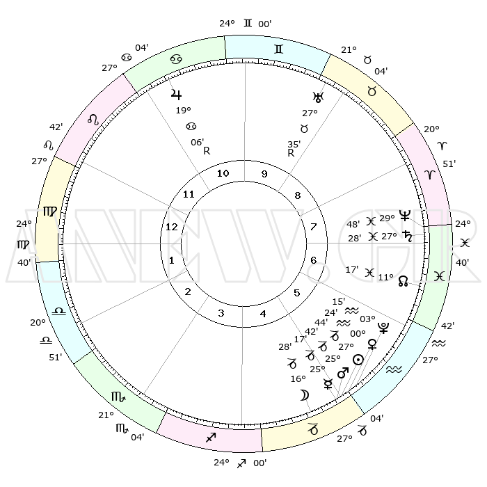 | | ΘΕΣΕΙΣ ΠΛΑΝΗΤΩΝ ΑΣΤΡΟΛΟΓΙΚΟΥ ΧΑΡΤΗ ΤΗΣ ΣΤΙΓΜΗΣ ΑΥΤΗΣ | | | | Πλανήτης | Ζώδιο | Μοίρες | Δεκαήμ. | Σε οίκο | Απόκλιση | | Ακμές των οίκων | | Ηλιος | Αιγόκερως | 27°39' | Τρίτο | 5 | 20 S 38 | | 1ος | 00°26' | Παρθένος | | Σελήνη | Αιγόκερως | 15°27' | Δεύτερο | 5 | 26 S 41 | | 2ος | 24°20' | Παρθένος | | Ερμής | Αιγόκερως | 25°09' | Τρίτο | 5 | 23 S 00 | | 3ος | 23°02' | Ζυγός | | Αφροδίτη | Υδροχόος | 00°18' | Πρώτο | 5 | 21 S 07 | | 4ος | 25°58' | Σκορπιός | | Αρης | Αιγόκερως | 25°38' | Τρίτο | 5 | 21 S 59 | | 5ος | 00°07' | Αιγόκερως | | Δίας | Καρκίνος | 19°07'R | Δεύτερο | 11 | 22 N 21 | | 6ος | 02°03' | Υδροχόος | | Κρόνος | Ιχθείς | 27°28' | Τρίτο | 8 | 03 S 02 | | 7ος | 00°26' | Ιχθείς | | Ουρανός | Ταύρος | 27°35'R | Τρίτο | 10 | 19 N 26 | | 8ος | 24°20' | Ιχθείς | | Ποσειδώνας | Ιχθείς | 29°48' | Τρίτο | 8 | 01 S 18 | | 9ος | 23°02' | Κριός | | Πλούτωνας | Υδροχόος | 03°15' | Πρώτο | 6 | 23 S 07 | | 10ος | 25°58' | Ταύρος | | Β. Δεσμός | Ιχθείς | 11°17' | Δεύτερο | 7 | 07 S 20 | | 11ος | 00°07' | Καρκίνος | | Ωροσκόπος | Παρθένος | 00°26' | Πρώτο | | | 12ος | 02°03' | Λέων | | Μεσουράνημα | Ταύρος | 25°58' | Τρίτο | | | |