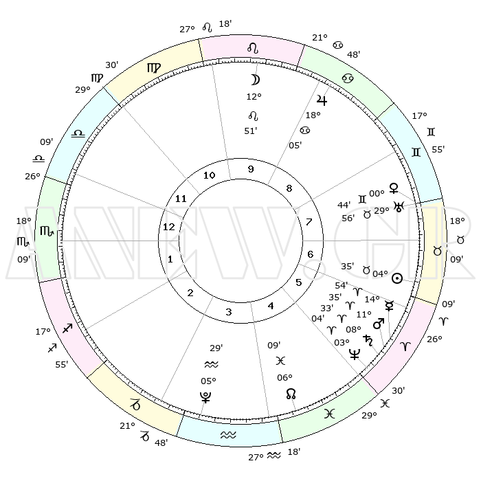 | | ΘΕΣΕΙΣ ΠΛΑΝΗΤΩΝ ΑΣΤΡΟΛΟΓΙΚΟΥ ΧΑΡΤΗ ΤΗΣ ΣΤΙΓΜΗΣ ΑΥΤΗΣ | | | | Πλανήτης | Ζώδιο | Μοίρες | Δεκαήμ. | Σε οίκο | Απόκλιση | | Ακμές των οίκων | | Ηλιος | Ταύρος | 04°31' | Πρώτο | 7 | 13 N 02 | | 1ος | 01°15' | Σκορπιός | | Σελήνη | Λέων | 12°03' | Δεύτερο | 10 | 19 N 16 | | 2ος | 29°44' | Σκορπιός | | Ερμής | Κριός | 14°48' | Δεύτερο | 6 | 03 N 34 | | 3ος | 01°47' | Αιγόκερως | | Αφροδίτη | Δίδυμοι | 00°39' | Πρώτο | 8 | 20 N 53 | | 4ος | 06°04' | Υδροχόος | | Αρης | Κριός | 11°32' | Δεύτερο | 6 | 03 N 43 | | 5ος | 08°58' | Ιχθείς | | Δίας | Καρκίνος | 18°05' | Δεύτερο | 9 | 22 N 36 | | 6ος | 07°31' | Κριός | | Κρόνος | Κριός | 08°32' | Πρώτο | 6 | 01 N 24 | | 7ος | 01°15' | Ταύρος | | Ουρανός | Ταύρος | 29°56' | Τρίτο | 8 | 19 N 58 | | 8ος | 29°44' | Ταύρος | | Ποσειδώνας | Κριός | 03°04' | Πρώτο | 5 | 00 N 00 | | 9ος | 01°47' | Καρκίνος | | Πλούτωνας | Υδροχόος | 05°29' | Πρώτο | 3 | 22 S 48 | | 10ος | 06°04' | Λέων | | Β. Δεσμός | Ιχθείς | 06°09' | Πρώτο | 4 | 09 S 15 | | 11ος | 08°58' | Παρθένος | | Ωροσκόπος | Σκορπιός | 01°15' | Πρώτο | | | 12ος | 07°31' | Ζυγός | | Μεσουράνημα | Λέων | 06°04' | Πρώτο | | | |