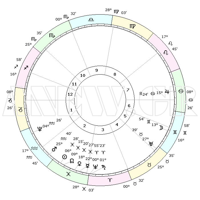 | | ΘΕΣΕΙΣ ΠΛΑΝΗΤΩΝ ΑΣΤΡΟΛΟΓΙΚΟΥ ΧΑΡΤΗ ΤΗΣ ΣΤΙΓΜΗΣ ΑΥΤΗΣ | | | | Πλανήτης | Ζώδιο | Μοίρες | Δεκαήμ. | Σε οίκο | Απόκλιση | | Ακμές των οίκων | | Ηλιος | Ιχθείς | 06°26' | Πρώτο | 2 | 09 S 09 | | 1ος | 23°23' | Τοξότης | | Σελήνη | Δίδυμοι | 13°16' | Δεύτερο | 6 | 27 N 36 | | 2ος | 28°55' | Αιγόκερως | | Ερμής | Ιχθείς | 22°26' | Τρίτο | 3 | 00 S 42 | | 3ος | 08°17' | Ιχθείς | | Αφροδίτη | Ιχθείς | 18°17' | Δεύτερο | 3 | 05 S 56 | | 4ος | 13°10' | Κριός | | Αρης | Υδροχόος | 25°38' | Τρίτο | 2 | 14 S 00 | | 5ος | 10°34' | Ταύρος | | Δίας | Καρκίνος | 15°25'R | Δεύτερο | 7 | 22 N 53 | | 6ος | 02°53' | Δίδυμοι | | Κρόνος | Κριός | 01°22' | Πρώτο | 3 | 01 S 25 | | 7ος | 23°23' | Δίδυμοι | | Ουρανός | Ταύρος | 27°39' | Τρίτο | 5 | 19 N 27 | | 8ος | 28°55' | Καρκίνος | | Ποσειδώνας | Κριός | 00°54' | Πρώτο | 3 | 00 S 50 | | 9ος | 08°17' | Παρθένος | | Πλούτωνας | Υδροχόος | 04°26' | Πρώτο | 2 | 22 S 54 | | 10ος | 13°10' | Ζυγός | | Β. Δεσμός | Ιχθείς | 09°15' | Πρώτο | 3 | 08 S 06 | | 11ος | 10°34' | Σκορπιός | | Ωροσκόπος | Τοξότης | 23°23' | Τρίτο | | | 12ος | 02°53' | Τοξότης | | Μεσουράνημα | Ζυγός | 13°10' | Δεύτερο | | | |