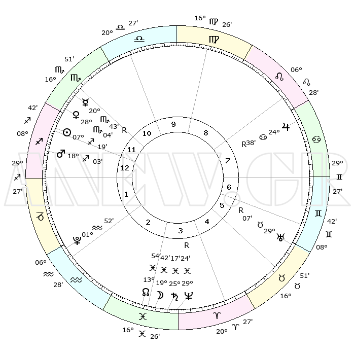 | | ΘΕΣΕΙΣ ΠΛΑΝΗΤΩΝ ΑΣΤΡΟΛΟΓΙΚΟΥ ΧΑΡΤΗ ΤΗΣ ΣΤΙΓΜΗΣ ΑΥΤΗΣ | | | | Πλανήτης | Ζώδιο | Μοίρες | Δεκαήμ. | Σε οίκο | Απόκλιση | | Ακμές των οίκων | | Ηλιος | Τοξότης | 07°15' | Πρώτο | 12 | 21 S 31 | | 1ος | 11°48' | Τοξότης | | Σελήνη | Ιχθείς | 18°56' | Δεύτερο | 3 | 04 S 00 | | 2ος | 14°51' | Αιγόκερως | | Ερμής | Σκορπιός | 20°44'R | Τρίτο | 11 | 15 S 30 | | 3ος | 22°33' | Υδροχόος | | Αφροδίτη | Σκορπιός | 27°60' | Τρίτο | 12 | 18 S 58 | | 4ος | 28°27' | Ιχθείς | | Αρης | Τοξότης | 18°00' | Δεύτερο | 1 | 23 S 32 | | 5ος | 27°47' | Κριός | | Δίας | Καρκίνος | 24°38'R | Τρίτο | 8 | 21 N 21 | | 6ος | 21°18' | Ταύρος | | Κρόνος | Ιχθείς | 25°17' | Τρίτο | 3 | 04 S 03 | | 7ος | 11°48' | Δίδυμοι | | Ουρανός | Ταύρος | 29°07'R | Τρίτο | 6 | 19 N 45 | | 8ος | 14°51' | Καρκίνος | | Ποσειδώνας | Ιχθείς | 29°24'R | Τρίτο | 4 | 01 S 29 | | 9ος | 22°33' | Λέων | | Πλούτωνας | Υδροχόος | 01°52' | Πρώτο | 2 | 23 S 24 | | 10ος | 28°27' | Παρθένος | | Β. Δεσμός | Ιχθείς | 13°54' | Δεύτερο | 3 | 06 S 20 | | 11ος | 27°47' | Ζυγός | | Ωροσκόπος | Τοξότης | 11°48' | Δεύτερο | | | 12ος | 21°18' | Σκορπιός | | Μεσουράνημα | Παρθένος | 28°27' | Τρίτο | | | |