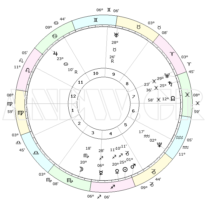 | | ΘΕΣΕΙΣ ΠΛΑΝΗΤΩΝ ΑΣΤΡΟΛΟΓΙΚΟΥ ΧΑΡΤΗ ΤΗΣ ΣΤΙΓΜΗΣ ΑΥΤΗΣ | | | | Πλανήτης | Ζώδιο | Μοίρες | Δεκαήμ. | Σε οίκο | Απόκλιση | | Ακμές των οίκων | | Ηλιος | Τοξότης | 24°49' | Τρίτο | 8 | 23 S 20 | | 1ος | 17°49' | Ταύρος | | Σελήνη | Σκορπιός | 16°17' | Δεύτερο | 6 | 21 S 00 | | 2ος | 15°21' | Δίδυμοι | | Ερμής | Τοξότης | 06°00' | Πρώτο | 7 | 19 S 59 | | 3ος | 07°24' | Καρκίνος | | Αφροδίτη | Τοξότης | 19°45' | Δεύτερο | 8 | 22 S 56 | | 4ος | 29°28' | Καρκίνος | | Αρης | Αιγόκερως | 00°56' | Πρώτο | 8 | 24 S 13 | | 5ος | 26°01' | Λέων | | Δίας | Καρκίνος | 23°12'R | Τρίτο | 3 | 21 N 38 | | 6ος | 02°17' | Ζυγός | | Κρόνος | Ιχθείς | 25°35' | Τρίτο | 11 | 03 S 53 | | 7ος | 17°49' | Σκορπιός | | Ουρανός | Ταύρος | 28°26'R | Τρίτο | 1 | 19 N 37 | | 8ος | 15°21' | Τοξότης | | Ποσειδώνας | Ιχθείς | 29°23' | Τρίτο | 11 | 01 S 29 | | 9ος | 07°24' | Αιγόκερως | | Πλούτωνας | Υδροχόος | 02°17' | Πρώτο | 10 | 23 S 19 | | 10ος | 29°28' | Αιγόκερως | | Β. Δεσμός | Ιχθείς | 12°59' | Δεύτερο | 11 | 06 S 41 | | 11ος | 26°01' | Υδροχόος | | Ωροσκόπος | Ταύρος | 17°49' | Δεύτερο | | | 12ος | 02°17' | Κριός | | Μεσουράνημα | Αιγόκερως | 29°28' | Τρίτο | | | |
