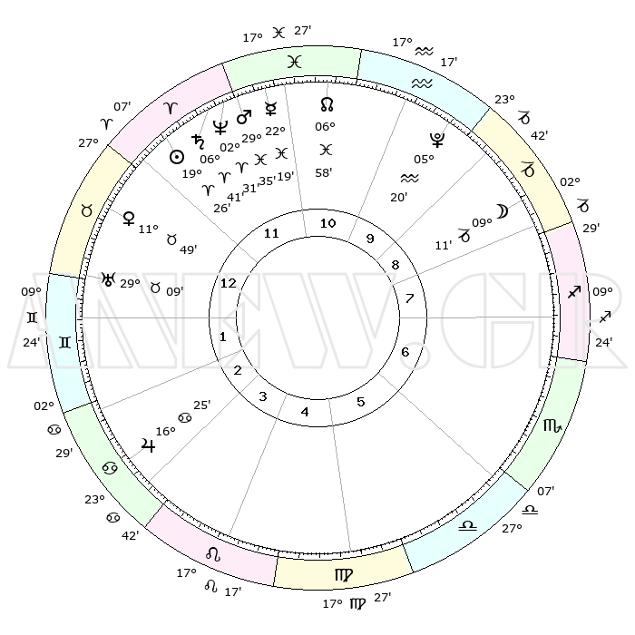 | | ΘΕΣΕΙΣ ΠΛΑΝΗΤΩΝ ΑΣΤΡΟΛΟΓΙΚΟΥ ΧΑΡΤΗ ΤΗΣ ΣΤΙΓΜΗΣ ΑΥΤΗΣ | | | | Πλανήτης | Ζώδιο | Μοίρες | Δεκαήμ. | Σε οίκο | Απόκλιση | | Ακμές των οίκων | | Ηλιος | Κριός | 19°22' | Δεύτερο | 12 | 07 N 35 | | 1ος | 08°42' | Ταύρος | | Σελήνη | Αιγόκερως | 08°22' | Πρώτο | 9 | 27 S 38 | | 2ος | 08°33' | Δίδυμοι | | Ερμής | Ιχθείς | 22°14' | Τρίτο | 11 | 05 S 10 | | 3ος | 01°18' | Καρκίνος | | Αφροδίτη | Ταύρος | 11°44' | Δεύτερο | 1 | 15 N 16 | | 4ος | 23°05' | Καρκίνος | | Αρης | Ιχθείς | 29°32' | Τρίτο | 12 | 01 S 07 | | 5ος | 18°26' | Λέων | | Δίας | Καρκίνος | 16°25' | Δεύτερο | 3 | 22 N 48 | | 6ος | 22°53' | Παρθένος | | Κρόνος | Κριός | 06°41' | Πρώτο | 12 | 00 N 41 | | 7ος | 08°42' | Σκορπιός | | Ουρανός | Ταύρος | 29°08' | Τρίτο | 1 | 19 N 48 | | 8ος | 08°33' | Τοξότης | | Ποσειδώνας | Κριός | 02°31' | Πρώτο | 12 | 00 S 12 | | 9ος | 01°18' | Αιγόκερως | | Πλούτωνας | Υδροχόος | 05°20' | Πρώτο | 10 | 22 S 47 | | 10ος | 23°05' | Αιγόκερως | | Β. Δεσμός | Ιχθείς | 06°58' | Πρώτο | 11 | 08 S 57 | | 11ος | 18°26' | Υδροχόος | | Ωροσκόπος | Ταύρος | 08°42' | Πρώτο | | | 12ος | 22°53' | Ιχθείς | | Μεσουράνημα | Αιγόκερως | 23°05' | Τρίτο | | | |