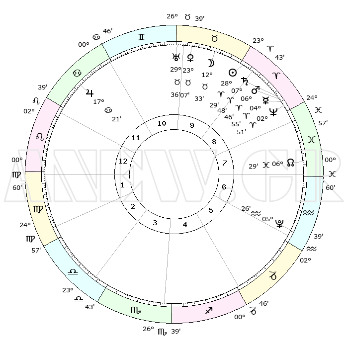 | | ΘΕΣΕΙΣ ΠΛΑΝΗΤΩΝ ΑΣΤΡΟΛΟΓΙΚΟΥ ΧΑΡΤΗ ΤΗΣ ΣΤΙΓΜΗΣ ΑΥΤΗΣ | | | | Πλανήτης | Ζώδιο | Μοίρες | Δεκαήμ. | Σε οίκο | Απόκλιση | | Ακμές των οίκων | | Ηλιος | Κριός | 28°25' | Τρίτο | 9 | 10 N 55 | | 1ος | 13°05' | Λέων | | Σελήνη | Ταύρος | 11°38' | Δεύτερο | 10 | 19 N 41 | | 2ος | 05°12' | Παρθένος | | Ερμής | Κριός | 04°50' | Πρώτο | 9 | 00 S 30 | | 3ος | 01°59' | Ζυγός | | Αφροδίτη | Ταύρος | 23°02' | Τρίτο | 10 | 18 N 51 | | 4ος | 04°17' | Σκορπιός | | Αρης | Κριός | 06°43' | Πρώτο | 9 | 01 N 47 | | 5ος | 09°42' | Τοξότης | | Δίας | Καρκίνος | 17°20' | Δεύτερο | 12 | 22 N 41 | | 6ος | 13°26' | Αιγόκερως | | Κρόνος | Κριός | 07°48' | Πρώτο | 9 | 01 N 07 | | 7ος | 13°05' | Υδροχόος | | Ουρανός | Ταύρος | 29°36' | Τρίτο | 10 | 19 N 54 | | 8ος | 05°12' | Ιχθείς | | Ποσειδώνας | Κριός | 02°51' | Πρώτο | 9 | 00 S 04 | | 9ος | 01°59' | Κριός | | Πλούτωνας | Υδροχόος | 05°26' | Πρώτο | 6 | 22 S 47 | | 10ος | 04°17' | Ταύρος | | Β. Δεσμός | Ιχθείς | 06°29' | Πρώτο | 8 | 09 S 08 | | 11ος | 09°42' | Δίδυμοι | | Ωροσκόπος | Λέων | 13°05' | Δεύτερο | | | 12ος | 13°26' | Καρκίνος | | Μεσουράνημα | Ταύρος | 04°17' | Πρώτο | | | |