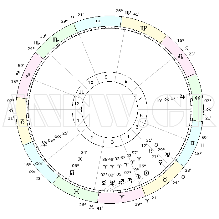 | | ΘΕΣΕΙΣ ΠΛΑΝΗΤΩΝ ΑΣΤΡΟΛΟΓΙΚΟΥ ΧΑΡΤΗ ΤΗΣ ΣΤΙΓΜΗΣ ΑΥΤΗΣ | | | | Πλανήτης | Ζώδιο | Μοίρες | Δεκαήμ. | Σε οίκο | Απόκλιση | | Ακμές των οίκων | | Ηλιος | Κριός | 26°53' | Τρίτο | 4 | 10 N 22 | | 1ος | 16°46' | Τοξότης | | Σελήνη | Κριός | 18°27' | Δεύτερο | 4 | 10 N 19 | | 2ος | 20°49' | Αιγόκερως | | Ερμής | Κριός | 02°30' | Πρώτο | 3 | 01 S 25 | | 3ος | 29°18' | Υδροχόος | | Αφροδίτη | Ταύρος | 21°07' | Τρίτο | 5 | 18 N 17 | | 4ος | 04°53' | Κριός | | Αρης | Κριός | 05°30' | Πρώτο | 4 | 01 N 17 | | 5ος | 03°24' | Ταύρος | | Δίας | Καρκίνος | 17°10' | Δεύτερο | 7 | 22 N 43 | | 6ος | 26°21' | Ταύρος | | Κρόνος | Κριός | 07°37' | Πρώτο | 4 | 01 N 03 | | 7ος | 16°46' | Δίδυμοι | | Ουρανός | Ταύρος | 29°31' | Τρίτο | 6 | 19 N 53 | | 8ος | 20°49' | Καρκίνος | | Ποσειδώνας | Κριός | 02°47' | Πρώτο | 3 | 00 S 06 | | 9ος | 29°18' | Λέων | | Πλούτωνας | Υδροχόος | 05°25' | Πρώτο | 2 | 22 S 47 | | 10ος | 04°53' | Ζυγός | | Β. Δεσμός | Ιχθείς | 06°34' | Πρώτο | 3 | 09 S 06 | | 11ος | 03°24' | Σκορπιός | | Ωροσκόπος | Τοξότης | 16°46' | Δεύτερο | | | 12ος | 26°21' | Σκορπιός | | Μεσουράνημα | Ζυγός | 04°53' | Πρώτο | | | |