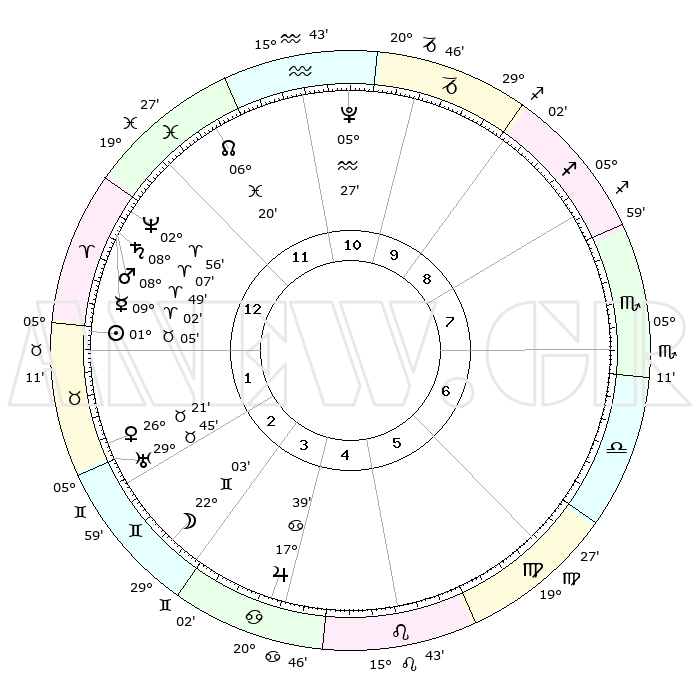 | | ΘΕΣΕΙΣ ΠΛΑΝΗΤΩΝ ΑΣΤΡΟΛΟΓΙΚΟΥ ΧΑΡΤΗ ΤΗΣ ΣΤΙΓΜΗΣ ΑΥΤΗΣ | | | | Πλανήτης | Ζώδιο | Μοίρες | Δεκαήμ. | Σε οίκο | Απόκλιση | | Ακμές των οίκων | | Ηλιος | Ταύρος | 01°01' | Πρώτο | 1 | 11 N 49 | | 1ος | 29°00' | Ιχθείς | | Σελήνη | Δίδυμοι | 21°06' | Τρίτο | 3 | 28 N 05 | | 2ος | 09°32' | Ταύρος | | Ερμής | Κριός | 08°56' | Πρώτο | 1 | 01 N 09 | | 3ος | 07°06' | Δίδυμοι | | Αφροδίτη | Ταύρος | 26°17' | Τρίτο | 2 | 19 N 45 | | 4ος | 29°27' | Δίδυμοι | | Αρης | Κριός | 08°46' | Πρώτο | 1 | 02 N 36 | | 5ος | 21°42' | Καρκίνος | | Δίας | Καρκίνος | 17°38' | Δεύτερο | 4 | 22 N 39 | | 6ος | 18°57' | Λέων | | Κρόνος | Κριός | 08°07' | Πρώτο | 1 | 01 N 14 | | 7ος | 29°00' | Παρθένος | | Ουρανός | Ταύρος | 29°44' | Τρίτο | 2 | 19 N 56 | | 8ος | 09°32' | Σκορπιός | | Ποσειδώνας | Κριός | 02°56' | Πρώτο | 1 | 00 S 02 | | 9ος | 07°06' | Τοξότης | | Πλούτωνας | Υδροχόος | 05°27' | Πρώτο | 11 | 22 S 48 | | 10ος | 29°27' | Τοξότης | | Β. Δεσμός | Ιχθείς | 06°20' | Πρώτο | 12 | 09 S 11 | | 11ος | 21°42' | Αιγόκερως | | Ωροσκόπος | Ιχθείς | 29°00' | Τρίτο | | | 12ος | 18°57' | Υδροχόος | | Μεσουράνημα | Τοξότης | 29°27' | Τρίτο | | | |