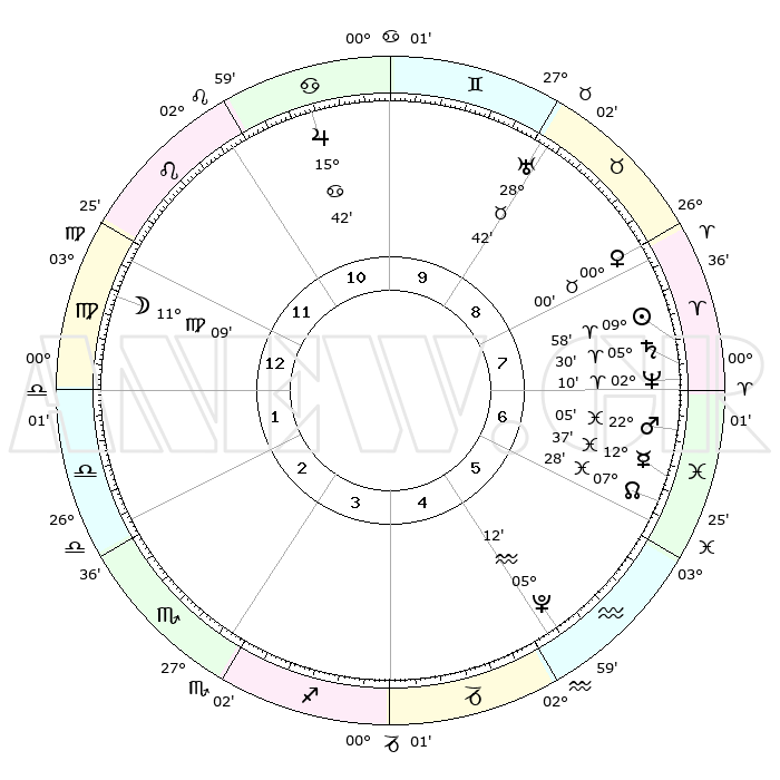| | ΘΕΣΕΙΣ ΠΛΑΝΗΤΩΝ ΑΣΤΡΟΛΟΓΙΚΟΥ ΧΑΡΤΗ ΤΗΣ ΣΤΙΓΜΗΣ ΑΥΤΗΣ | | | | Πλανήτης | Ζώδιο | Μοίρες | Δεκαήμ. | Σε οίκο | Απόκλιση | | Ακμές των οίκων | | Ηλιος | Κριός | 09°54' | Πρώτο | 8 | 03 N 55 | | 1ος | 09°22' | Παρθένος | | Σελήνη | Παρθένος | 10°14' | Δεύτερο | 1 | 07 N 36 | | 2ος | 04°11' | Ζυγός | | Ερμής | Ιχθείς | 12°34' | Δεύτερο | 7 | 07 S 50 | | 3ος | 03°36' | Σκορπιός | | Αφροδίτη | Κριός | 29°55' | Τρίτο | 8 | 10 N 58 | | 4ος | 06°33' | Τοξότης | | Αρης | Ιχθείς | 22°02' | Τρίτο | 7 | 04 S 08 | | 5ος | 10°10' | Αιγόκερως | | Δίας | Καρκίνος | 15°42' | Δεύτερο | 11 | 22 N 53 | | 6ος | 11°30' | Υδροχόος | | Κρόνος | Κριός | 05°29' | Πρώτο | 8 | 00 N 13 | | 7ος | 09°22' | Ιχθείς | | Ουρανός | Ταύρος | 28°42' | Τρίτο | 9 | 19 N 42 | | 8ος | 04°11' | Κριός | | Ποσειδώνας | Κριός | 02°09' | Πρώτο | 7 | 00 S 21 | | 9ος | 03°36' | Ταύρος | | Πλούτωνας | Υδροχόος | 05°12' | Πρώτο | 5 | 22 S 48 | | 10ος | 06°33' | Δίδυμοι | | Β. Δεσμός | Ιχθείς | 07°29' | Πρώτο | 6 | 08 S 46 | | 11ος | 10°10' | Καρκίνος | | Ωροσκόπος | Παρθένος | 09°22' | Πρώτο | | | 12ος | 11°30' | Λέων | | Μεσουράνημα | Δίδυμοι | 06°33' | Πρώτο | | | |