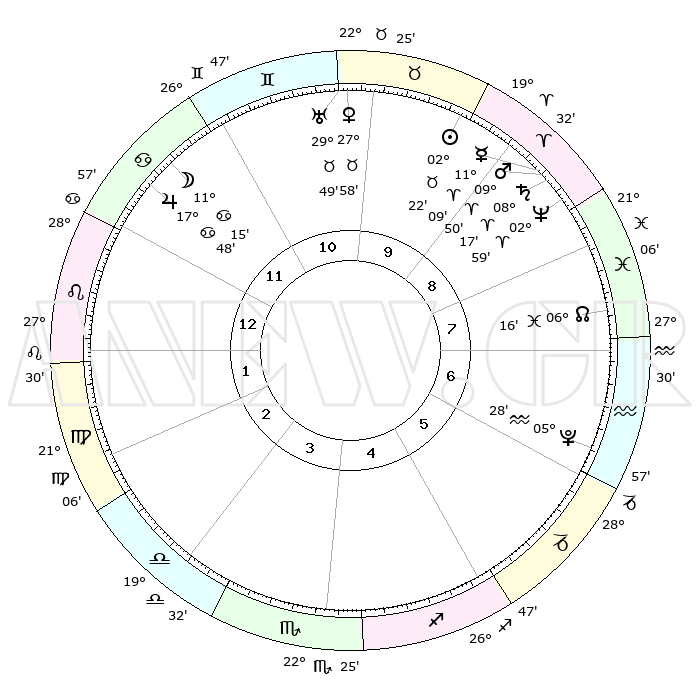 | | ΘΕΣΕΙΣ ΠΛΑΝΗΤΩΝ ΑΣΤΡΟΛΟΓΙΚΟΥ ΧΑΡΤΗ ΤΗΣ ΣΤΙΓΜΗΣ ΑΥΤΗΣ | | | | Πλανήτης | Ζώδιο | Μοίρες | Δεκαήμ. | Σε οίκο | Απόκλιση | | Ακμές των οίκων | | Ηλιος | Ταύρος | 02°18' | Πρώτο | 10 | 12 N 16 | | 1ος | 09°24' | Λέων | | Σελήνη | Καρκίνος | 10°21' | Δεύτερο | 12 | 27 N 18 | | 2ος | 01°11' | Παρθένος | | Ερμής | Κριός | 11°03' | Δεύτερο | 9 | 02 N 01 | | 3ος | 27°30' | Παρθένος | | Αφροδίτη | Ταύρος | 27°53' | Τρίτο | 10 | 20 N 11 | | 4ος | 29°31' | Ζυγός | | Αρης | Κριός | 09°47' | Πρώτο | 9 | 03 N 01 | | 5ος | 05°09' | Τοξότης | | Δίας | Καρκίνος | 17°48' | Δεύτερο | 12 | 22 N 38 | | 6ος | 09°24' | Αιγόκερως | | Κρόνος | Κριός | 08°16' | Πρώτο | 9 | 01 N 18 | | 7ος | 09°24' | Υδροχόος | | Ουρανός | Ταύρος | 29°49' | Τρίτο | 10 | 19 N 57 | | 8ος | 01°11' | Ιχθείς | | Ποσειδώνας | Κριός | 02°59' | Πρώτο | 9 | 00 S 01 | | 9ος | 27°30' | Ιχθείς | | Πλούτωνας | Υδροχόος | 05°28' | Πρώτο | 6 | 22 S 48 | | 10ος | 29°31' | Κριός | | Β. Δεσμός | Ιχθείς | 06°16' | Πρώτο | 8 | 09 S 13 | | 11ος | 05°09' | Δίδυμοι | | Ωροσκόπος | Λέων | 09°24' | Πρώτο | | | 12ος | 09°24' | Καρκίνος | | Μεσουράνημα | Κριός | 29°31' | Τρίτο | | | |