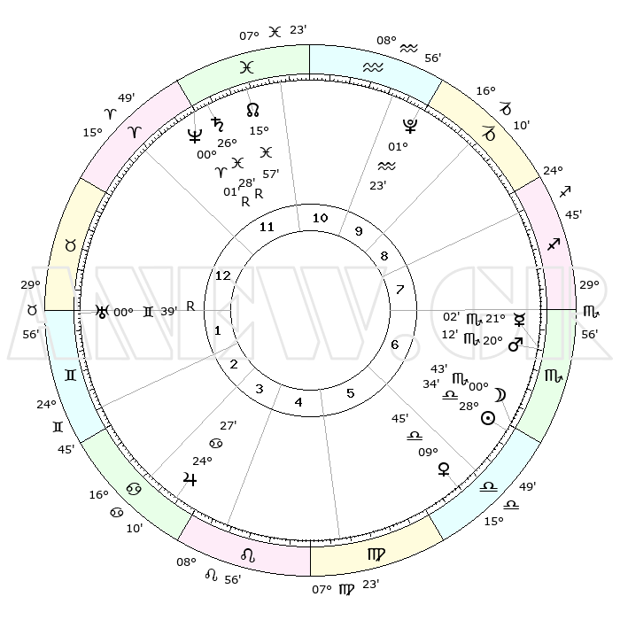 | ΘΕΣΕΙΣ ΠΛΑΝΗΤΩΝ ΑΣΤΡΟΛΟΓΙΚΟΥ ΧΑΡΤΗ ΤΗΣ ΣΤΙΓΜΗΣ ΑΥΤΗΣ | | Πλανήτης | Ζώδιο | Μοίρες | Δεκαήμ. | Σε οίκο | Απόκλιση | | Ακμές των οίκων | Ηλιος | Ζυγός | 28°29' | Τρίτο | 7 | 10 S 56 | | 1ος | 17°26' | Κριός | Σελήνη | Ζυγός | 29°42' | Τρίτο | 7 | 14 S 35 | | 2ος | 23°09' | Ταύρος | Ερμής | Σκορπιός | 20°56' | Τρίτο | 7 | 20 S 16 | | 3ος | 18°08' | Δίδυμοι | Αφροδίτη | Ζυγός | 09°38' | Πρώτο | 6 | 02 S 24 | | 4ος | 09°54' | Καρκίνος | Αρης | Σκορπιός | 20°08' | Τρίτο | 7 | 18 S 03 | | 5ος | 03°14' | Λέων | Δίας | Καρκίνος | 24°26' | Τρίτο | 4 | 21 N 17 | | 6ος | 03°33' | Παρθένος | Κρόνος | Ιχθείς | 26°28'R | Τρίτο | 12 | 03 S 41 | | 7ος | 17°26' | Ζυγός | Ουρανός | Δίδυμοι | 00°39'R | Πρώτο | 2 | 20 N 04 | | 8ος | 23°09' | Σκορπιός | Ποσειδώνας | Κριός | 00°01'R | Πρώτο | 12 | 01 S 15 | | 9ος | 18°08' | Τοξότης | Πλούτωνας | Υδροχόος | 01°23' | Πρώτο | 10 | 23 S 32 | | 10ος | 09°54' | Αιγόκερως | Β. Δεσμός | Ιχθείς | 15°57' | Δεύτερο | 12 | 05 S 32 | | 11ος | 03°14' | Υδροχόος | Ωροσκόπος | Κριός | 17°26' | Δεύτερο | | | 12ος | 03°33' | Ιχθείς | Μεσουράνημα | Αιγόκερως | 09°54' | Πρώτο | | | |