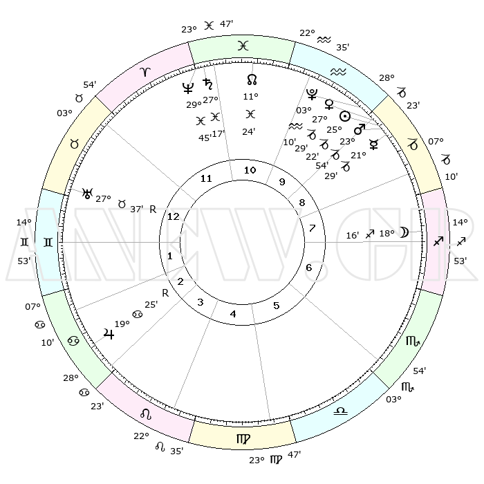 | | ΘΕΣΕΙΣ ΠΛΑΝΗΤΩΝ ΑΣΤΡΟΛΟΓΙΚΟΥ ΧΑΡΤΗ ΤΗΣ ΣΤΙΓΜΗΣ ΑΥΤΗΣ | | | | Πλανήτης | Ζώδιο | Μοίρες | Δεκαήμ. | Σε οίκο | Απόκλιση | | Ακμές των οίκων | | Ηλιος | Αιγόκερως | 25°18' | Τρίτο | 9 | 21 S 04 | | 1ος | 21°03' | Ταύρος | | Σελήνη | Τοξότης | 17°35' | Δεύτερο | 7 | 27 S 55 | | 2ος | 17°49' | Δίδυμοι | | Ερμής | Αιγόκερως | 21°23' | Τρίτο | 9 | 23 S 31 | | 3ος | 09°39' | Καρκίνος | | Αφροδίτη | Αιγόκερως | 27°25' | Τρίτο | 9 | 21 S 39 | | 4ος | 01°52' | Λέων | | Αρης | Αιγόκερως | 23°51' | Τρίτο | 9 | 22 S 17 | | 5ος | 28°53' | Λέων | | Δίας | Καρκίνος | 19°25'R | Δεύτερο | 3 | 22 N 18 | | 6ος | 05°47' | Ζυγός | | Κρόνος | Ιχθείς | 27°17' | Τρίτο | 11 | 03 S 07 | | 7ος | 21°03' | Σκορπιός | | Ουρανός | Ταύρος | 27°37'R | Τρίτο | 1 | 19 N 26 | | 8ος | 17°49' | Τοξότης | | Ποσειδώνας | Ιχθείς | 29°45' | Τρίτο | 11 | 01 S 19 | | 9ος | 09°39' | Αιγόκερως | | Πλούτωνας | Υδροχόος | 03°10' | Πρώτο | 10 | 23 S 08 | | 10ος | 01°52' | Υδροχόος | | Β. Δεσμός | Ιχθείς | 11°24' | Δεύτερο | 11 | 07 S 17 | | 11ος | 28°53' | Υδροχόος | | Ωροσκόπος | Ταύρος | 21°03' | Τρίτο | | | 12ος | 05°47' | Κριός | | Μεσουράνημα | Υδροχόος | 01°52' | Πρώτο | | | |