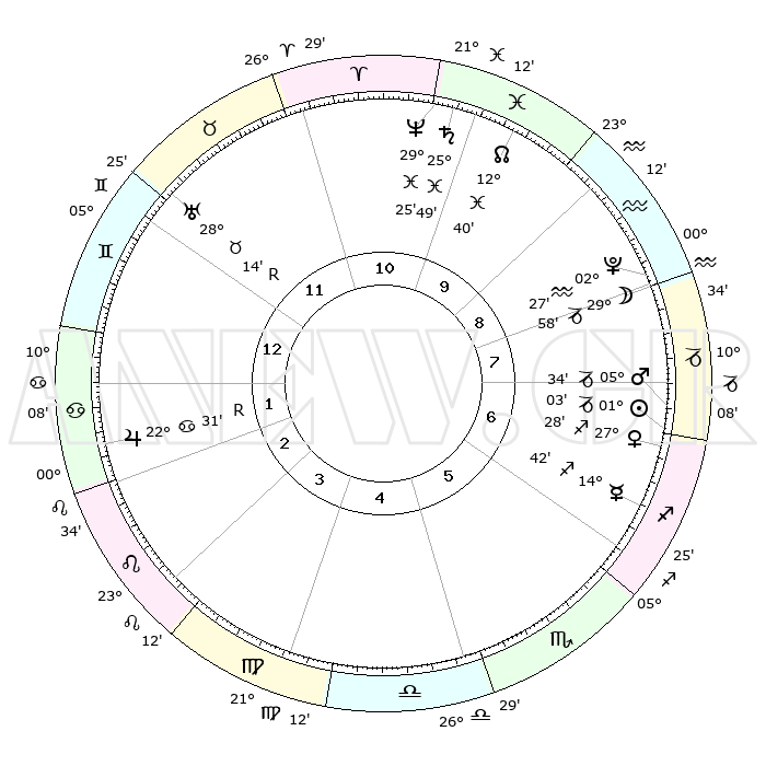 | | ΘΕΣΕΙΣ ΠΛΑΝΗΤΩΝ ΑΣΤΡΟΛΟΓΙΚΟΥ ΧΑΡΤΗ ΤΗΣ ΣΤΙΓΜΗΣ ΑΥΤΗΣ | | | | Πλανήτης | Ζώδιο | Μοίρες | Δεκαήμ. | Σε οίκο | Απόκλιση | | Ακμές των οίκων | | Ηλιος | Αιγόκερως | 00°58' | Πρώτο | 7 | 23 S 26 | | 1ος | 12°10' | Δίδυμοι | | Σελήνη | Αιγόκερως | 28°57' | Τρίτο | 9 | 23 S 42 | | 2ος | 04°50' | Καρκίνος | | Ερμής | Τοξότης | 14°34' | Δεύτερο | 7 | 21 S 59 | | 3ος | 26°03' | Καρκίνος | | Αφροδίτη | Τοξότης | 27°21' | Τρίτο | 7 | 23 S 33 | | 4ος | 19°55' | Λέων | | Αρης | Αιγόκερως | 05°30' | Πρώτο | 8 | 24 S 09 | | 5ος | 20°37' | Παρθένος | | Δίας | Καρκίνος | 22°32'R | Τρίτο | 2 | 21 N 46 | | 6ος | 00°32' | Σκορπιός | | Κρόνος | Ιχθείς | 25°49' | Τρίτο | 11 | 03 S 46 | | 7ος | 12°10' | Τοξότης | | Ουρανός | Ταύρος | 28°14'R | Τρίτο | 12 | 19 N 34 | | 8ος | 04°50' | Αιγόκερως | | Ποσειδώνας | Ιχθείς | 29°25' | Τρίτο | 11 | 01 S 28 | | 9ος | 26°03' | Αιγόκερως | | Πλούτωνας | Υδροχόος | 02°27' | Πρώτο | 9 | 23 S 17 | | 10ος | 19°55' | Υδροχόος | | Β. Δεσμός | Ιχθείς | 12°40' | Δεύτερο | 10 | 06 S 48 | | 11ος | 20°37' | Ιχθείς | | Ωροσκόπος | Δίδυμοι | 12°10' | Δεύτερο | | | 12ος | 00°32' | Ταύρος | | Μεσουράνημα | Υδροχόος | 19°55' | Δεύτερο | | | |