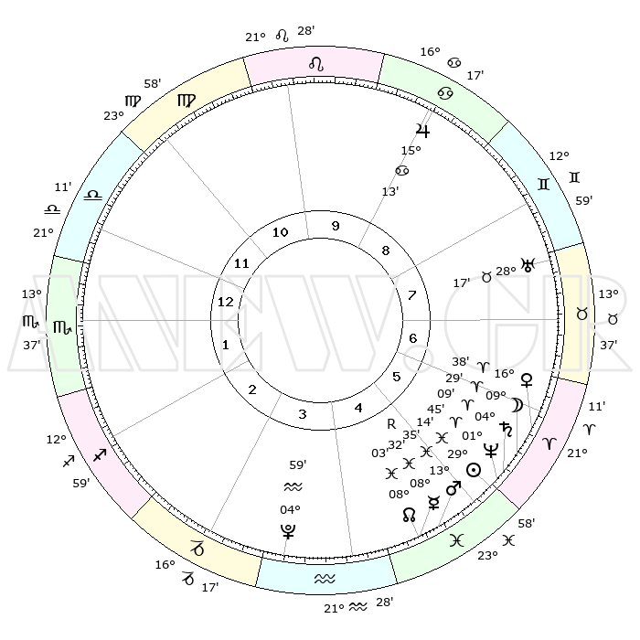 | | ΘΕΣΕΙΣ ΠΛΑΝΗΤΩΝ ΑΣΤΡΟΛΟΓΙΚΟΥ ΧΑΡΤΗ ΤΗΣ ΣΤΙΓΜΗΣ ΑΥΤΗΣ | | | | Πλανήτης | Ζώδιο | Μοίρες | Δεκαήμ. | Σε οίκο | Απόκλιση | | Ακμές των οίκων | | Ηλιος | Ιχθείς | 29°11' | Τρίτο | 5 | 00 S 20 | | 1ος | 25°28' | Ζυγός | | Σελήνη | Κριός | 08°36' | Πρώτο | 6 | 05 N 48 | | 2ος | 23°37' | Σκορπιός | | Ερμής | Ιχθείς | 08°33'R | Πρώτο | 5 | 07 S 13 | | 3ος | 25°15' | Τοξότης | | Αφροδίτη | Κριός | 16°33' | Δεύτερο | 6 | 05 N 41 | | 4ος | 29°08' | Αιγόκερως | | Αρης | Ιχθείς | 13°32' | Δεύτερο | 5 | 07 S 28 | | 5ος | 02°05' | Ιχθείς | | Δίας | Καρκίνος | 15°12' | Δεύτερο | 9 | 22 N 56 | | 6ος | 01°09' | Κριός | | Κρόνος | Κριός | 04°08' | Πρώτο | 6 | 00 S 18 | | 7ος | 25°28' | Κριός | | Ουρανός | Ταύρος | 28°17' | Τρίτο | 8 | 19 N 36 | | 8ος | 23°37' | Ταύρος | | Ποσειδώνας | Κριός | 01°45' | Πρώτο | 6 | 00 S 30 | | 9ος | 25°15' | Δίδυμοι | | Πλούτωνας | Υδροχόος | 04°59' | Πρώτο | 4 | 22 S 49 | | 10ος | 29°08' | Καρκίνος | | Β. Δεσμός | Ιχθείς | 08°03' | Πρώτο | 5 | 08 S 33 | | 11ος | 02°05' | Παρθένος | | Ωροσκόπος | Ζυγός | 25°28' | Τρίτο | | | 12ος | 01°09' | Ζυγός | | Μεσουράνημα | Καρκίνος | 29°08' | Τρίτο | | | |
