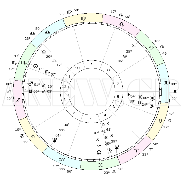 | | ΘΕΣΕΙΣ ΠΛΑΝΗΤΩΝ ΑΣΤΡΟΛΟΓΙΚΟΥ ΧΑΡΤΗ ΤΗΣ ΣΤΙΓΜΗΣ ΑΥΤΗΣ | | | | Πλανήτης | Ζώδιο | Μοίρες | Δεκαήμ. | Σε οίκο | Απόκλιση | | Ακμές των οίκων | | Ηλιος | Σκορπιός | 13°27' | Δεύτερο | 7 | 15 S 52 | | 1ος | 08°54' | Ταύρος | | Σελήνη | Ταύρος | 14°28' | Δεύτερο | 1 | 20 N 16 | | 2ος | 08°42' | Δίδυμοι | | Ερμής | Τοξότης | 05°44' | Πρώτο | 7 | 24 S 00 | | 3ος | 01°25' | Καρκίνος | | Αφροδίτη | Ζυγός | 28°22' | Τρίτο | 6 | 09 S 35 | | 4ος | 23°13' | Καρκίνος | | Αρης | Τοξότης | 00°47' | Πρώτο | 7 | 20 S 44 | | 5ος | 18°35' | Λέων | | Δίας | Καρκίνος | 25°05' | Τρίτο | 4 | 21 N 12 | | 6ος | 23°05' | Παρθένος | | Κρόνος | Ιχθείς | 25°44'R | Τρίτο | 12 | 03 S 57 | | 7ος | 08°54' | Σκορπιός | | Ουρανός | Δίδυμοι | 00°06'R | Πρώτο | 1 | 19 N 58 | | 8ος | 08°42' | Τοξότης | | Ποσειδώνας | Ιχθείς | 29°42'R | Τρίτο | 12 | 01 S 22 | | 9ος | 01°25' | Αιγόκερως | | Πλούτωνας | Υδροχόος | 01°29' | Πρώτο | 10 | 23 S 30 | | 10ος | 23°13' | Αιγόκερως | | Β. Δεσμός | Ιχθείς | 15°09' | Δεύτερο | 11 | 05 S 51 | | 11ος | 18°35' | Υδροχόος | | Ωροσκόπος | Ταύρος | 08°54' | Πρώτο | | | 12ος | 23°05' | Ιχθείς | | Μεσουράνημα | Αιγόκερως | 23°13' | Τρίτο | | | |