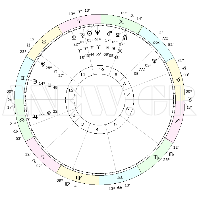 | | ΘΕΣΕΙΣ ΠΛΑΝΗΤΩΝ ΑΣΤΡΟΛΟΓΙΚΟΥ ΧΑΡΤΗ ΤΗΣ ΣΤΙΓΜΗΣ ΑΥΤΗΣ | | | | Πλανήτης | Ζώδιο | Μοίρες | Δεκαήμ. | Σε οίκο | Απόκλιση | | Ακμές των οίκων | | Ηλιος | Κριός | 03°40' | Πρώτο | 11 | 01 N 28 | | 1ος | 05°16' | Δίδυμοι | | Σελήνη | Δίδυμοι | 13°50' | Δεύτερο | 1 | 27 N 38 | | 2ος | 29°04' | Δίδυμοι | | Ερμής | Ιχθείς | 09°04' | Πρώτο | 10 | 08 S 01 | | 3ος | 20°21' | Καρκίνος | | Αφροδίτη | Κριός | 22°10' | Τρίτο | 12 | 07 N 56 | | 4ος | 13°32' | Λέων | | Αρης | Ιχθείς | 17°06' | Δεύτερο | 11 | 06 S 05 | | 5ος | 12°56' | Παρθένος | | Δίας | Καρκίνος | 15°22' | Δεύτερο | 2 | 22 N 55 | | 6ος | 22°08' | Ζυγός | | Κρόνος | Κριός | 04°42' | Πρώτο | 11 | 00 S 05 | | 7ος | 05°16' | Τοξότης | | Ουρανός | Ταύρος | 28°27' | Τρίτο | 12 | 19 N 38 | | 8ος | 29°04' | Τοξότης | | Ποσειδώνας | Κριός | 01°55' | Πρώτο | 11 | 00 S 26 | | 9ος | 20°21' | Αιγόκερως | | Πλούτωνας | Υδροχόος | 05°05' | Πρώτο | 9 | 22 S 48 | | 10ος | 13°32' | Υδροχόος | | Β. Δεσμός | Ιχθείς | 07°49' | Πρώτο | 10 | 08 S 38 | | 11ος | 12°56' | Ιχθείς | | Ωροσκόπος | Δίδυμοι | 05°16' | Πρώτο | | | 12ος | 22°08' | Κριός | | Μεσουράνημα | Υδροχόος | 13°32' | Δεύτερο | | | |
