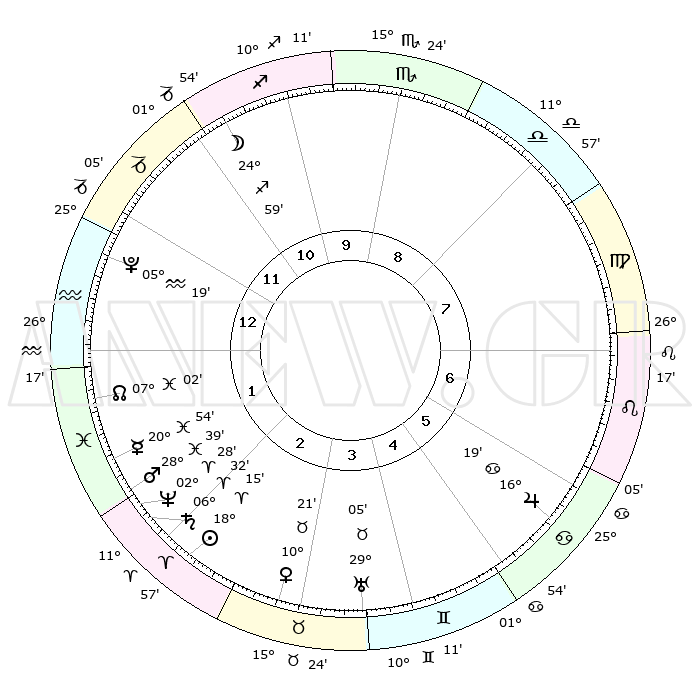 | | ΘΕΣΕΙΣ ΠΛΑΝΗΤΩΝ ΑΣΤΡΟΛΟΓΙΚΟΥ ΧΑΡΤΗ ΤΗΣ ΣΤΙΓΜΗΣ ΑΥΤΗΣ | | | | Πλανήτης | Ζώδιο | Μοίρες | Δεκαήμ. | Σε οίκο | Απόκλιση | | Ακμές των οίκων | | Ηλιος | Κριός | 18°12' | Δεύτερο | 2 | 07 N 08 | | 1ος | 27°52' | Αιγόκερως | | Σελήνη | Τοξότης | 24°16' | Τρίτο | 11 | 28 S 16 | | 2ος | 11°36' | Ιχθείς | | Ερμής | Ιχθείς | 20°49' | Τρίτο | 2 | 05 S 38 | | 3ος | 20°22' | Κριός | | Αφροδίτη | Ταύρος | 10°17' | Δεύτερο | 3 | 14 N 46 | | 4ος | 19°12' | Ταύρος | | Αρης | Ιχθείς | 28°37' | Τρίτο | 2 | 01 S 29 | | 5ος | 12°08' | Δίδυμοι | | Δίας | Καρκίνος | 16°19' | Δεύτερο | 6 | 22 N 49 | | 6ος | 03°28' | Καρκίνος | | Κρόνος | Κριός | 06°32' | Πρώτο | 2 | 00 N 38 | | 7ος | 27°52' | Καρκίνος | | Ουρανός | Ταύρος | 29°05' | Τρίτο | 4 | 19 N 47 | | 8ος | 11°36' | Παρθένος | | Ποσειδώνας | Κριός | 02°28' | Πρώτο | 2 | 00 S 13 | | 9ος | 20°22' | Ζυγός | | Πλούτωνας | Υδροχόος | 05°19' | Πρώτο | 1 | 22 S 47 | | 10ος | 19°12' | Σκορπιός | | Β. Δεσμός | Ιχθείς | 07°02' | Πρώτο | 1 | 08 S 56 | | 11ος | 12°08' | Τοξότης | | Ωροσκόπος | Αιγόκερως | 27°52' | Τρίτο | | | 12ος | 03°29' | Αιγόκερως | | Μεσουράνημα | Σκορπιός | 19°12' | Δεύτερο | | | |