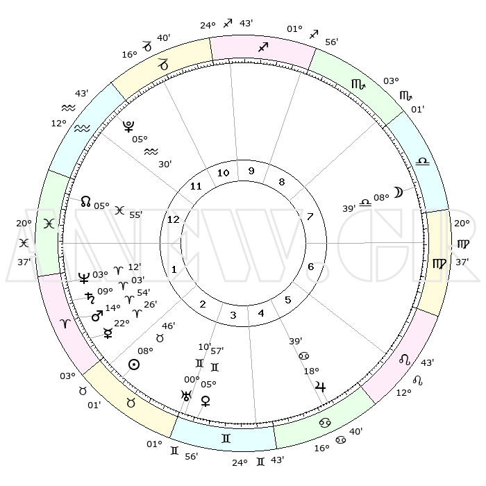 | | ΘΕΣΕΙΣ ΠΛΑΝΗΤΩΝ ΑΣΤΡΟΛΟΓΙΚΟΥ ΧΑΡΤΗ ΤΗΣ ΣΤΙΓΜΗΣ ΑΥΤΗΣ | | | | Πλανήτης | Ζώδιο | Μοίρες | Δεκαήμ. | Σε οίκο | Απόκλιση | | Ακμές των οίκων | | Ηλιος | Ταύρος | 08°44' | Πρώτο | 2 | 14 N 25 | | 1ος | 00°35' | Ιχθείς | | Σελήνη | Ζυγός | 08°12' | Πρώτο | 7 | 05 S 39 | | 2ος | 15°57' | Κριός | | Ερμής | Κριός | 22°22' | Τρίτο | 2 | 06 N 44 | | 3ος | 18°33' | Ταύρος | | Αφροδίτη | Δίδυμοι | 05°55' | Πρώτο | 3 | 22 N 05 | | 4ος | 12°54' | Δίδυμοι | | Αρης | Κριός | 14°52' | Δεύτερο | 1 | 05 N 02 | | 5ος | 04°35' | Καρκίνος | | Δίας | Καρκίνος | 18°39' | Δεύτερο | 5 | 22 N 31 | | 6ος | 28°12' | Καρκίνος | | Κρόνος | Κριός | 09°02' | Πρώτο | 1 | 01 N 35 | | 7ος | 00°35' | Παρθένος | | Ουρανός | Δίδυμοι | 00°10' | Πρώτο | 3 | 20 N 01 | | 8ος | 15°57' | Ζυγός | | Ποσειδώνας | Κριός | 03°12' | Πρώτο | 1 | 00 N 04 | | 9ος | 18°33' | Σκορπιός | | Πλούτωνας | Υδροχόος | 05°30' | Πρώτο | 12 | 22 S 49 | | 10ος | 12°54' | Τοξότης | | Β. Δεσμός | Ιχθείς | 05°55' | Πρώτο | 1 | 09 S 20 | | 11ος | 04°35' | Αιγόκερως | | Ωροσκόπος | Ιχθείς | 00°35' | Πρώτο | | | 12ος | 28°12' | Αιγόκερως | | Μεσουράνημα | Τοξότης | 12°54' | Δεύτερο | | | |