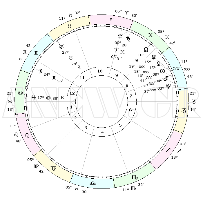 | | ΘΕΣΕΙΣ ΠΛΑΝΗΤΩΝ ΑΣΤΡΟΛΟΓΙΚΟΥ ΧΑΡΤΗ ΤΗΣ ΣΤΙΓΜΗΣ ΑΥΤΗΣ | | | | Πλανήτης | Ζώδιο | Μοίρες | Δεκαήμ. | Σε οίκο | Απόκλιση | | Ακμές των οίκων | | Ηλιος | Υδροχόος | 09°36' | Πρώτο | 8 | 17 S 50 | | 1ος | 28°21' | Δίδυμοι | | Σελήνη | Δίδυμοι | 23°52' | Τρίτο | 12 | 28 N 19 | | 2ος | 19°15' | Καρκίνος | | Ερμής | Υδροχόος | 15°07' | Δεύτερο | 9 | 18 S 13 | | 3ος | 10°57' | Λέων | | Αφροδίτη | Υδροχόος | 15°04' | Δεύτερο | 9 | 17 S 34 | | 4ος | 07°01' | Παρθένος | | Αρης | Υδροχόος | 04°48' | Πρώτο | 8 | 20 S 04 | | 5ος | 10°41' | Ζυγός | | Δίας | Καρκίνος | 17°38'R | Δεύτερο | 1 | 22 N 34 | | 6ος | 20°47' | Σκορπιός | | Κρόνος | Ιχθείς | 28°31' | Τρίτο | 10 | 02 S 35 | | 7ος | 28°21' | Τοξότης | | Ουρανός | Ταύρος | 27°28'R | Τρίτο | 12 | 19 N 24 | | 8ος | 19°15' | Αιγόκερως | | Ποσειδώνας | Κριός | 00°05' | Πρώτο | 10 | 01 S 11 | | 9ος | 10°57' | Υδροχόος | | Πλούτωνας | Υδροχόος | 03°37' | Πρώτο | 8 | 23 S 02 | | 10ος | 07°01' | Ιχθείς | | Β. Δεσμός | Ιχθείς | 10°40' | Δεύτερο | 10 | 07 S 34 | | 11ος | 10°41' | Κριός | | Ωροσκόπος | Δίδυμοι | 28°21' | Τρίτο | | | 12ος | 20°47' | Ταύρος | | Μεσουράνημα | Ιχθείς | 07°01' | Πρώτο | | | |