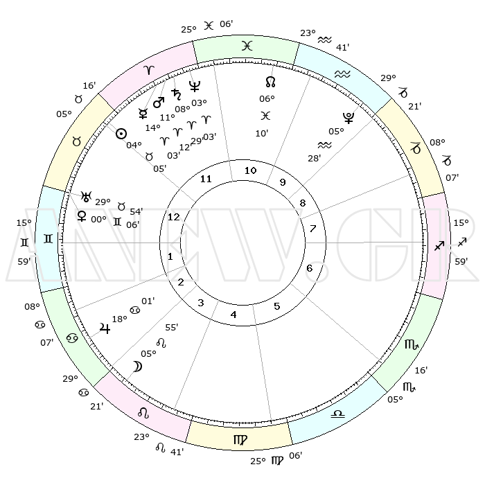 | | ΘΕΣΕΙΣ ΠΛΑΝΗΤΩΝ ΑΣΤΡΟΛΟΓΙΚΟΥ ΧΑΡΤΗ ΤΗΣ ΣΤΙΓΜΗΣ ΑΥΤΗΣ | | | | Πλανήτης | Ζώδιο | Μοίρες | Δεκαήμ. | Σε οίκο | Απόκλιση | | Ακμές των οίκων | | Ηλιος | Ταύρος | 04°02' | Πρώτο | 12 | 12 N 52 | | 1ος | 23°40' | Ταύρος | | Σελήνη | Λέων | 05°10' | Πρώτο | 4 | 21 N 37 | | 2ος | 19°50' | Δίδυμοι | | Ερμής | Κριός | 13°57' | Δεύτερο | 12 | 03 N 13 | | 3ος | 11°31' | Καρκίνος | | Αφροδίτη | Δίδυμοι | 00°02' | Πρώτο | 1 | 20 N 44 | | 4ος | 03°52' | Λέων | | Αρης | Κριός | 11°09' | Δεύτερο | 12 | 03 N 33 | | 5ος | 01°18' | Παρθένος | | Δίας | Καρκίνος | 18°01' | Δεύτερο | 3 | 22 N 36 | | 6ος | 08°40' | Ζυγός | | Κρόνος | Κριός | 08°29' | Πρώτο | 11 | 01 N 23 | | 7ος | 23°40' | Σκορπιός | | Ουρανός | Ταύρος | 29°54' | Τρίτο | 1 | 19 N 58 | | 8ος | 19°49' | Τοξότης | | Ποσειδώνας | Κριός | 03°03' | Πρώτο | 11 | 00 N 00 | | 9ος | 11°31' | Αιγόκερως | | Πλούτωνας | Υδροχόος | 05°28' | Πρώτο | 10 | 22 S 48 | | 10ος | 03°52' | Υδροχόος | | Β. Δεσμός | Ιχθείς | 06°11' | Πρώτο | 11 | 09 S 15 | | 11ος | 01°18' | Ιχθείς | | Ωροσκόπος | Ταύρος | 23°40' | Τρίτο | | | 12ος | 08°40' | Κριός | | Μεσουράνημα | Υδροχόος | 03°52' | Πρώτο | | | |