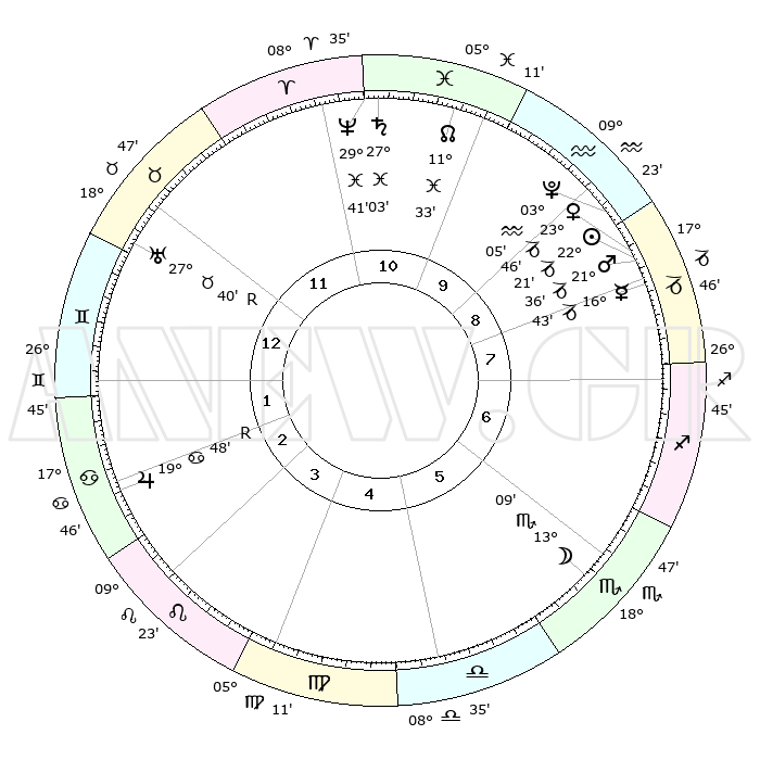 | | ΘΕΣΕΙΣ ΠΛΑΝΗΤΩΝ ΑΣΤΡΟΛΟΓΙΚΟΥ ΧΑΡΤΗ ΤΗΣ ΣΤΙΓΜΗΣ ΑΥΤΗΣ | | | | Πλανήτης | Ζώδιο | Μοίρες | Δεκαήμ. | Σε οίκο | Απόκλιση | | Ακμές των οίκων | | Ηλιος | Αιγόκερως | 22°13' | Τρίτο | 10 | 21 S 36 | | 1ος | 03°60' | Ταύρος | | Σελήνη | Σκορπιός | 11°39' | Δεύτερο | 7 | 19 S 36 | | 2ος | 05°07' | Δίδυμοι | | Ερμής | Αιγόκερως | 16°31' | Δεύτερο | 9 | 24 S 01 | | 3ος | 28°17' | Δίδυμοι | | Αφροδίτη | Αιγόκερως | 23°36' | Τρίτο | 10 | 22 S 16 | | 4ος | 20°00' | Καρκίνος | | Αρης | Αιγόκερως | 21°30' | Τρίτο | 10 | 22 S 40 | | 5ος | 14°49' | Λέων | | Δίας | Καρκίνος | 19°49'R | Δεύτερο | 3 | 22 N 14 | | 6ος | 18°20' | Παρθένος | | Κρόνος | Ιχθείς | 27°03' | Τρίτο | 12 | 03 S 13 | | 7ος | 03°60' | Σκορπιός | | Ουρανός | Ταύρος | 27°41'R | Τρίτο | 1 | 19 N 27 | | 8ος | 05°07' | Τοξότης | | Ποσειδώνας | Ιχθείς | 29°41' | Τρίτο | 12 | 01 S 20 | | 9ος | 28°17' | Τοξότης | | Πλούτωνας | Υδροχόος | 03°05' | Πρώτο | 10 | 23 S 09 | | 10ος | 20°00' | Αιγόκερως | | Β. Δεσμός | Ιχθείς | 11°34' | Δεύτερο | 11 | 07 S 14 | | 11ος | 14°49' | Υδροχόος | | Ωροσκόπος | Ταύρος | 03°60' | Πρώτο | | | 12ος | 18°20' | Ιχθείς | | Μεσουράνημα | Αιγόκερως | 20°00' | Τρίτο | | | |