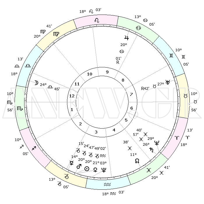 | | ΘΕΣΕΙΣ ΠΛΑΝΗΤΩΝ ΑΣΤΡΟΛΟΓΙΚΟΥ ΧΑΡΤΗ ΤΗΣ ΣΤΙΓΜΗΣ ΑΥΤΗΣ | | | | Πλανήτης | Ζώδιο | Μοίρες | Δεκαήμ. | Σε οίκο | Απόκλιση | | Ακμές των οίκων | | Ηλιος | Αιγόκερως | 20°09' | Τρίτο | 10 | 21 S 55 | | 1ος | 15°38' | Κριός | | Σελήνη | Ζυγός | 17°20' | Δεύτερο | 7 | 09 S 40 | | 2ος | 21°51' | Ταύρος | | Ερμής | Αιγόκερως | 13°17' | Δεύτερο | 10 | 24 S 14 | | 3ος | 17°03' | Δίδυμοι | | Αφροδίτη | Αιγόκερως | 21°03' | Τρίτο | 10 | 22 S 37 | | 4ος | 08°52' | Καρκίνος | | Αρης | Αιγόκερως | 19°56' | Δεύτερο | 10 | 22 S 53 | | 5ος | 02°03' | Λέων | | Δίας | Καρκίνος | 20°06'R | Τρίτο | 4 | 22 N 11 | | 6ος | 02°03' | Παρθένος | | Κρόνος | Ιχθείς | 26°54' | Τρίτο | 12 | 03 S 17 | | 7ος | 15°38' | Ζυγός | | Ουρανός | Ταύρος | 27°43'R | Τρίτο | 2 | 19 N 27 | | 8ος | 21°51' | Σκορπιός | | Ποσειδώνας | Ιχθείς | 29°39' | Τρίτο | 12 | 01 S 21 | | 9ος | 17°03' | Τοξότης | | Πλούτωνας | Υδροχόος | 03°01' | Πρώτο | 11 | 23 S 09 | | 10ος | 08°52' | Αιγόκερως | | Β. Δεσμός | Ιχθείς | 11°40' | Δεύτερο | 12 | 07 S 11 | | 11ος | 02°03' | Υδροχόος | | Ωροσκόπος | Κριός | 15°38' | Δεύτερο | | | 12ος | 02°03' | Ιχθείς | | Μεσουράνημα | Αιγόκερως | 08°52' | Πρώτο | | | |