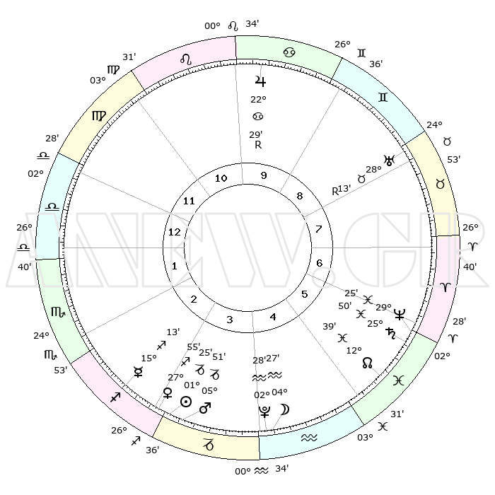 | | ΘΕΣΕΙΣ ΠΛΑΝΗΤΩΝ ΑΣΤΡΟΛΟΓΙΚΟΥ ΧΑΡΤΗ ΤΗΣ ΣΤΙΓΜΗΣ ΑΥΤΗΣ | | | | Πλανήτης | Ζώδιο | Μοίρες | Δεκαήμ. | Σε οίκο | Απόκλιση | | Ακμές των οίκων | | Ηλιος | Αιγόκερως | 01°20' | Πρώτο | 3 | 23 S 26 | | 1ος | 02°49' | Ζυγός | | Σελήνη | Υδροχόος | 03°27' | Πρώτο | 4 | 22 S 24 | | 2ος | 29°36' | Ζυγός | | Ερμής | Τοξότης | 15°06' | Δεύτερο | 3 | 22 S 05 | | 3ος | 00°08' | Τοξότης | | Αφροδίτη | Τοξότης | 27°49' | Τρίτο | 3 | 23 S 34 | | 4ος | 03°09' | Αιγόκερως | | Αρης | Αιγόκερως | 05°47' | Πρώτο | 4 | 24 S 08 | | 5ος | 06°07' | Υδροχόος | | Δίας | Καρκίνος | 22°29'R | Τρίτο | 10 | 21 N 46 | | 6ος | 06°26' | Ιχθείς | | Κρόνος | Ιχθείς | 25°49' | Τρίτο | 6 | 03 S 46 | | 7ος | 02°49' | Κριός | | Ουρανός | Ταύρος | 28°13'R | Τρίτο | 8 | 19 N 34 | | 8ος | 29°36' | Κριός | | Ποσειδώνας | Ιχθείς | 29°25' | Τρίτο | 6 | 01 S 28 | | 9ος | 00°08' | Δίδυμοι | | Πλούτωνας | Υδροχόος | 02°27' | Πρώτο | 4 | 23 S 17 | | 10ος | 03°09' | Καρκίνος | | Β. Δεσμός | Ιχθείς | 12°39' | Δεύτερο | 6 | 06 S 49 | | 11ος | 06°07' | Λέων | | Ωροσκόπος | Ζυγός | 02°49' | Πρώτο | | | 12ος | 06°26' | Παρθένος | | Μεσουράνημα | Καρκίνος | 03°09' | Πρώτο | | | |