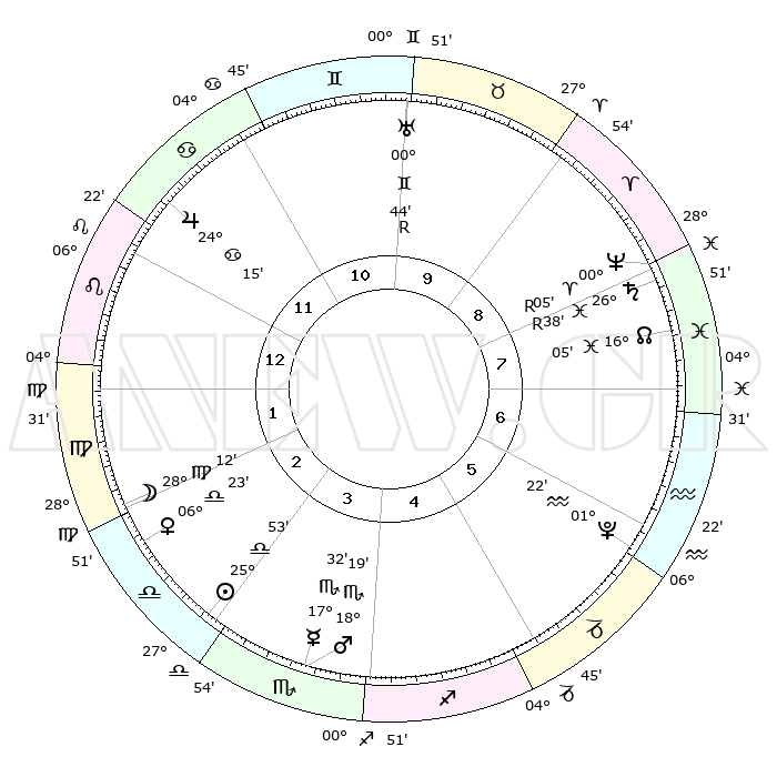 | ΘΕΣΕΙΣ ΠΛΑΝΗΤΩΝ ΑΣΤΡΟΛΟΓΙΚΟΥ ΧΑΡΤΗ ΤΗΣ ΣΤΙΓΜΗΣ ΑΥΤΗΣ | | Πλανήτης | Ζώδιο | Μοίρες | Δεκαήμ. | Σε οίκο | Απόκλιση | | Ακμές των οίκων | Ηλιος | Ζυγός | 25°34' | Τρίτο | 6 | 09 S 53 | | 1ος | 24°14' | Ταύρος | Σελήνη | Παρθένος | 24°23' | Τρίτο | 5 | 01 N 42 | | 2ος | 20°16' | Δίδυμοι | Ερμής | Σκορπιός | 17°07' | Δεύτερο | 6 | 18 S 58 | | 3ος | 11°56' | Καρκίνος | Αφροδίτη | Ζυγός | 06°00' | Πρώτο | 5 | 00 S 59 | | 4ος | 04°19' | Λέων | Αρης | Σκορπιός | 18°06' | Δεύτερο | 6 | 17 S 28 | | 5ος | 01°49' | Παρθένος | Δίας | Καρκίνος | 24°14' | Τρίτο | 3 | 21 N 19 | | 6ος | 09°18' | Ζυγός | Κρόνος | Ιχθείς | 26°39'R | Τρίτο | 11 | 03 S 37 | | 7ος | 24°14' | Σκορπιός | Ουρανός | Δίδυμοι | 00°44'R | Πρώτο | 1 | 20 N 06 | | 8ος | 20°16' | Τοξότης | Ποσειδώνας | Κριός | 00°05'R | Πρώτο | 11 | 01 S 14 | | 9ος | 11°56' | Αιγόκερως | Πλούτωνας | Υδροχόος | 01°22' | Πρώτο | 9 | 23 S 32 | | 10ος | 04°19' | Υδροχόος | Β. Δεσμός | Ιχθείς | 16°06' | Δεύτερο | 11 | 05 S 29 | | 11ος | 01°49' | Ιχθείς | Ωροσκόπος | Ταύρος | 24°14' | Τρίτο | | | 12ος | 09°18' | Κριός | Μεσουράνημα | Υδροχόος | 04°19' | Πρώτο | | | |