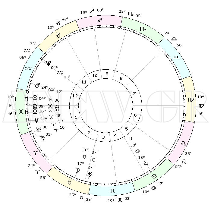 | | ΘΕΣΕΙΣ ΠΛΑΝΗΤΩΝ ΑΣΤΡΟΛΟΓΙΚΟΥ ΧΑΡΤΗ ΤΗΣ ΣΤΙΓΜΗΣ ΑΥΤΗΣ | | | | Πλανήτης | Ζώδιο | Μοίρες | Δεκαήμ. | Σε οίκο | Απόκλιση | | Ακμές των οίκων | | Ηλιος | Ιχθείς | 04°31' | Πρώτο | 1 | 09 S 51 | | 1ος | 01°06' | Υδροχόος | | Σελήνη | Ταύρος | 16°26' | Δεύτερο | 3 | 21 N 25 | | 2ος | 15°23' | Ιχθείς | | Ερμής | Ιχθείς | 21°46' | Τρίτο | 2 | 01 S 23 | | 3ος | 23°39' | Κριός | | Αφροδίτη | Ιχθείς | 15°55' | Δεύτερο | 2 | 06 S 52 | | 4ος | 21°55' | Ταύρος | | Αρης | Υδροχόος | 24°08' | Τρίτο | 1 | 14 S 30 | | 5ος | 14°36' | Δίδυμοι | | Δίας | Καρκίνος | 15°30'R | Δεύτερο | 6 | 22 N 52 | | 6ος | 06°04' | Καρκίνος | | Κρόνος | Κριός | 01°09' | Πρώτο | 2 | 01 S 30 | | 7ος | 01°06' | Λέων | | Ουρανός | Ταύρος | 27°37' | Τρίτο | 4 | 19 N 27 | | 8ος | 15°23' | Παρθένος | | Ποσειδώνας | Κριός | 00°51' | Πρώτο | 2 | 00 S 52 | | 9ος | 23°39' | Ζυγός | | Πλούτωνας | Υδροχόος | 04°22' | Πρώτο | 1 | 22 S 54 | | 10ος | 21°55' | Σκορπιός | | Β. Δεσμός | Ιχθείς | 09°21' | Πρώτο | 1 | 08 S 04 | | 11ος | 14°36' | Τοξότης | | Ωροσκόπος | Υδροχόος | 01°06' | Πρώτο | | | 12ος | 06°04' | Αιγόκερως | | Μεσουράνημα | Σκορπιός | 21°55' | Τρίτο | | | |