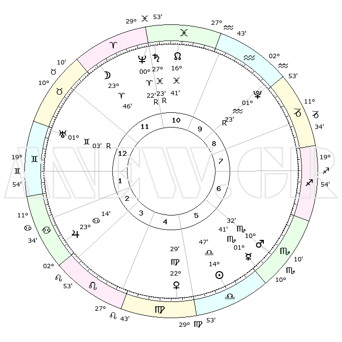 | ΘΕΣΕΙΣ ΠΛΑΝΗΤΩΝ ΑΣΤΡΟΛΟΓΙΚΟΥ ΧΑΡΤΗ ΤΗΣ ΣΤΙΓΜΗΣ ΑΥΤΗΣ | | Πλανήτης | Ζώδιο | Μοίρες | Δεκαήμ. | Σε οίκο | Απόκλιση | | Ακμές των οίκων | Ηλιος | Ζυγός | 14°41' | Δεύτερο | 6 | 05 S 47 | | 1ος | 07°28' | Ταύρος | Σελήνη | Κριός | 22°17' | Τρίτο | 12 | 11 N 23 | | 2ος | 07°39' | Δίδυμοι | Ερμής | Σκορπιός | 01°32' | Πρώτο | 6 | 12 S 51 | | 3ος | 00°30' | Καρκίνος | Αφροδίτη | Παρθένος | 22°21' | Τρίτο | 6 | 04 N 20 | | 4ος | 22°16' | Καρκίνος | Αρης | Σκορπιός | 10°28' | Δεύτερο | 7 | 15 S 06 | | 5ος | 17°28' | Λέων | Δίας | Καρκίνος | 23°14' | Τρίτο | 4 | 21 N 28 | | 6ος | 21°41' | Παρθένος | Κρόνος | Ιχθείς | 27°24'R | Τρίτο | 12 | 03 S 20 | | 7ος | 07°28' | Σκορπιός | Ουρανός | Δίδυμοι | 01°03'R | Πρώτο | 1 | 20 N 09 | | 8ος | 07°39' | Τοξότης | Ποσειδώνας | Κριός | 00°22'R | Πρώτο | 12 | 01 S 07 | | 9ος | 00°30' | Αιγόκερως | Πλούτωνας | Υδροχόος | 01°23'R | Πρώτο | 10 | 23 S 32 | | 10ος | 22°16' | Αιγόκερως | Β. Δεσμός | Ιχθείς | 16°41' | Δεύτερο | 11 | 05 S 15 | | 11ος | 17°28' | Υδροχόος | Ωροσκόπος | Ταύρος | 07°28' | Πρώτο | | | 12ος | 21°41' | Ιχθείς | Μεσουράνημα | Αιγόκερως | 22°16' | Τρίτο | | | |