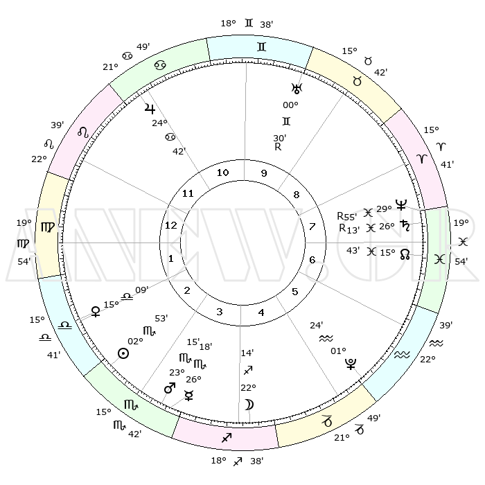 | | ΘΕΣΕΙΣ ΠΛΑΝΗΤΩΝ ΑΣΤΡΟΛΟΓΙΚΟΥ ΧΑΡΤΗ ΤΗΣ ΣΤΙΓΜΗΣ ΑΥΤΗΣ | | | | Πλανήτης | Ζώδιο | Μοίρες | Δεκαήμ. | Σε οίκο | Απόκλιση | | Ακμές των οίκων | | Ηλιος | Σκορπιός | 02°48' | Πρώτο | 3 | 12 S 26 | | 1ος | 26°20' | Λέων | | Σελήνη | Τοξότης | 21°16' | Τρίτο | 4 | 28 S 15 | | 2ος | 19°48' | Παρθένος | | Ερμής | Σκορπιός | 26°12' | Τρίτο | 4 | 21 S 54 | | 3ος | 18°08' | Ζυγός | | Αφροδίτη | Ζυγός | 15°03' | Δεύτερο | 2 | 04 S 31 | | 4ος | 20°59' | Σκορπιός | | Αρης | Σκορπιός | 23°12' | Τρίτο | 4 | 18 S 53 | | 5ος | 25°26' | Τοξότης | | Δίας | Καρκίνος | 24°42' | Τρίτο | 11 | 21 N 15 | | 6ος | 27°42' | Αιγόκερως | | Κρόνος | Ιχθείς | 26°13'R | Τρίτο | 8 | 03 S 47 | | 7ος | 26°20' | Υδροχόος | | Ουρανός | Δίδυμοι | 00°30'R | Πρώτο | 10 | 20 N 03 | | 8ος | 19°48' | Ιχθείς | | Ποσειδώνας | Ιχθείς | 29°55'R | Τρίτο | 8 | 01 S 17 | | 9ος | 18°08' | Κριός | | Πλούτωνας | Υδροχόος | 01°24' | Πρώτο | 6 | 23 S 32 | | 10ος | 20°59' | Ταύρος | | Β. Δεσμός | Ιχθείς | 15°43' | Δεύτερο | 7 | 05 S 38 | | 11ος | 25°26' | Δίδυμοι | | Ωροσκόπος | Λέων | 26°20' | Τρίτο | | | 12ος | 27°42' | Καρκίνος | | Μεσουράνημα | Ταύρος | 20°59' | Τρίτο | | | |
