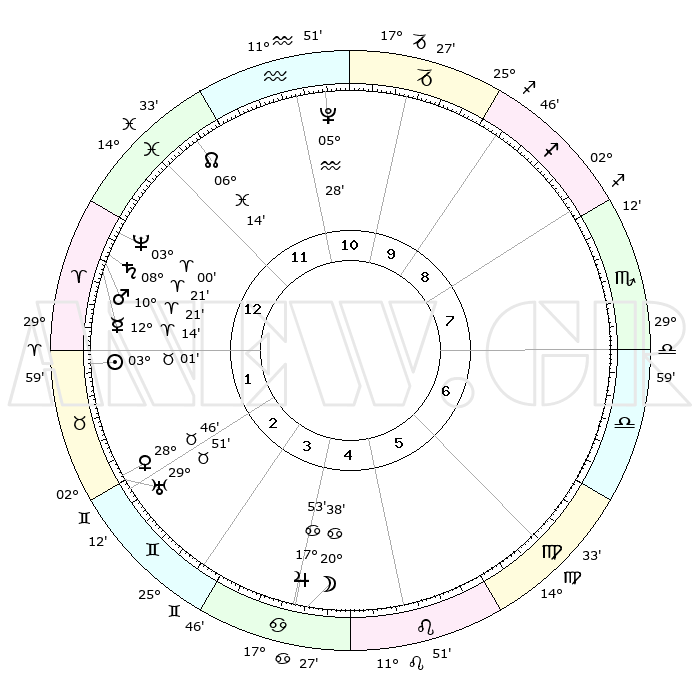 | | ΘΕΣΕΙΣ ΠΛΑΝΗΤΩΝ ΑΣΤΡΟΛΟΓΙΚΟΥ ΧΑΡΤΗ ΤΗΣ ΣΤΙΓΜΗΣ ΑΥΤΗΣ | | | | Πλανήτης | Ζώδιο | Μοίρες | Δεκαήμ. | Σε οίκο | Απόκλιση | | Ακμές των οίκων | | Ηλιος | Ταύρος | 02°57' | Πρώτο | 2 | 12 N 29 | | 1ος | 19°34' | Ιχθείς | | Σελήνη | Καρκίνος | 19°39' | Δεύτερο | 5 | 25 N 44 | | 2ος | 02°10' | Ταύρος | | Ερμής | Κριός | 12°07' | Δεύτερο | 1 | 02 N 27 | | 3ος | 01°16' | Δίδυμοι | | Αφροδίτη | Ταύρος | 28°41' | Τρίτο | 2 | 20 N 23 | | 4ος | 24°07' | Δίδυμοι | | Αρης | Κριός | 10°18' | Δεύτερο | 1 | 03 N 13 | | 5ος | 16°03' | Καρκίνος | | Δίας | Καρκίνος | 17°53' | Δεύτερο | 5 | 22 N 37 | | 6ος | 11°56' | Λέων | | Κρόνος | Κριός | 08°21' | Πρώτο | 1 | 01 N 20 | | 7ος | 19°34' | Παρθένος | | Ουρανός | Ταύρος | 29°51' | Τρίτο | 2 | 19 N 57 | | 8ος | 02°10' | Σκορπιός | | Ποσειδώνας | Κριός | 03°00' | Πρώτο | 1 | 00 S 01 | | 9ος | 01°16' | Τοξότης | | Πλούτωνας | Υδροχόος | 05°28' | Πρώτο | 11 | 22 S 48 | | 10ος | 24°07' | Τοξότης | | Β. Δεσμός | Ιχθείς | 06°14' | Πρώτο | 12 | 09 S 13 | | 11ος | 16°03' | Αιγόκερως | | Ωροσκόπος | Ιχθείς | 19°34' | Δεύτερο | | | 12ος | 11°56' | Υδροχόος | | Μεσουράνημα | Τοξότης | 24°07' | Τρίτο | | | |
