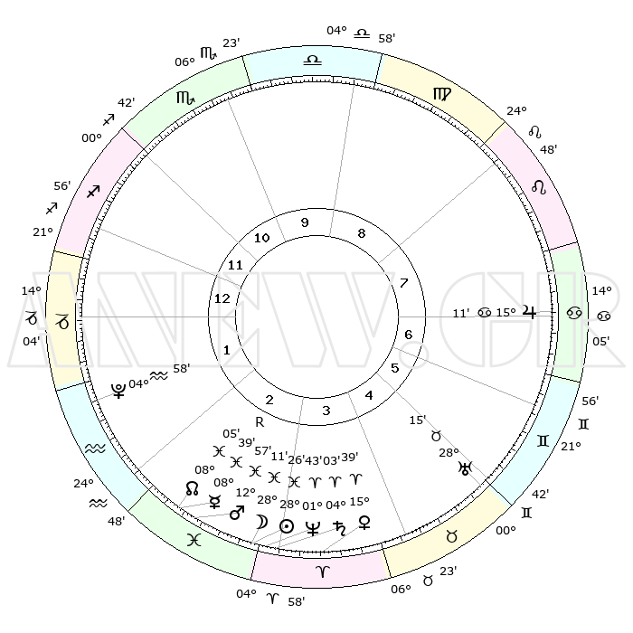 | | ΘΕΣΕΙΣ ΠΛΑΝΗΤΩΝ ΑΣΤΡΟΛΟΓΙΚΟΥ ΧΑΡΤΗ ΤΗΣ ΣΤΙΓΜΗΣ ΑΥΤΗΣ | | | | Πλανήτης | Ζώδιο | Μοίρες | Δεκαήμ. | Σε οίκο | Απόκλιση | | Ακμές των οίκων | | Ηλιος | Ιχθείς | 28°22' | Τρίτο | 3 | 00 S 39 | | 1ος | 22°10' | Τοξότης | | Σελήνη | Ιχθείς | 27°17' | Τρίτο | 3 | 00 N 26 | | 2ος | 27°25' | Αιγόκερως | | Ερμής | Ιχθείς | 08°40'R | Πρώτο | 3 | 06 S 59 | | 3ος | 06°39' | Ιχθείς | | Αφροδίτη | Κριός | 15°34' | Δεύτερο | 4 | 05 N 16 | | 4ος | 11°41' | Κριός | | Αρης | Ιχθείς | 12°54' | Δεύτερο | 3 | 07 S 43 | | 5ος | 09°17' | Ταύρος | | Δίας | Καρκίνος | 15°11' | Δεύτερο | 7 | 22 N 56 | | 6ος | 01°42' | Δίδυμοι | | Κρόνος | Κριός | 04°02' | Πρώτο | 3 | 00 S 21 | | 7ος | 22°10' | Δίδυμοι | | Ουρανός | Ταύρος | 28°15' | Τρίτο | 5 | 19 N 36 | | 8ος | 27°25' | Καρκίνος | | Ποσειδώνας | Κριός | 01°43' | Πρώτο | 3 | 00 S 31 | | 9ος | 06°39' | Παρθένος | | Πλούτωνας | Υδροχόος | 04°58' | Πρώτο | 2 | 22 S 49 | | 10ος | 11°41' | Ζυγός | | Β. Δεσμός | Ιχθείς | 08°06' | Πρώτο | 3 | 08 S 32 | | 11ος | 09°17' | Σκορπιός | | Ωροσκόπος | Τοξότης | 22°10' | Τρίτο | | | 12ος | 01°42' | Τοξότης | | Μεσουράνημα | Ζυγός | 11°41' | Δεύτερο | | | |