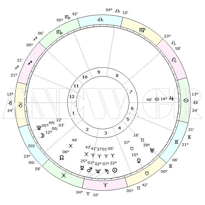 | | ΘΕΣΕΙΣ ΠΛΑΝΗΤΩΝ ΑΣΤΡΟΛΟΓΙΚΟΥ ΧΑΡΤΗ ΤΗΣ ΣΤΙΓΜΗΣ ΑΥΤΗΣ | | | | Πλανήτης | Ζώδιο | Μοίρες | Δεκαήμ. | Σε οίκο | Απόκλιση | | Ακμές των οίκων | | Ηλιος | Κριός | 22°02' | Τρίτο | 4 | 08 N 35 | | 1ος | 24°41' | Τοξότης | | Σελήνη | Υδροχόος | 11°22' | Δεύτερο | 2 | 19 S 36 | | 2ος | 00°31' | Υδροχόος | | Ερμής | Ιχθείς | 25°38' | Τρίτο | 3 | 04 S 00 | | 3ος | 10°02' | Ιχθείς | | Αφροδίτη | Ταύρος | 15°03' | Δεύτερο | 5 | 16 N 23 | | 4ος | 14°46' | Κριός | | Αρης | Κριός | 01°39' | Πρώτο | 3 | 00 S 16 | | 5ος | 11°57' | Ταύρος | | Δίας | Καρκίνος | 16°40' | Δεύτερο | 7 | 22 N 46 | | 6ος | 04°08' | Δίδυμοι | | Κρόνος | Κριός | 07°01' | Πρώτο | 3 | 00 N 49 | | 7ος | 24°41' | Δίδυμοι | | Ουρανός | Ταύρος | 29°16' | Τρίτο | 5 | 19 N 49 | | 8ος | 00°31' | Λέων | | Ποσειδώνας | Κριός | 02°37' | Πρώτο | 3 | 00 S 10 | | 9ος | 10°02' | Παρθένος | | Πλούτωνας | Υδροχόος | 05°22' | Πρώτο | 2 | 22 S 47 | | 10ος | 14°46' | Ζυγός | | Β. Δεσμός | Ιχθείς | 06°49' | Πρώτο | 2 | 09 S 00 | | 11ος | 11°57' | Σκορπιός | | Ωροσκόπος | Τοξότης | 24°41' | Τρίτο | | | 12ος | 04°08' | Τοξότης | | Μεσουράνημα | Ζυγός | 14°46' | Δεύτερο | | | |