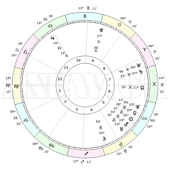 | | ΘΕΣΕΙΣ ΠΛΑΝΗΤΩΝ ΑΣΤΡΟΛΟΓΙΚΟΥ ΧΑΡΤΗ ΤΗΣ ΣΤΙΓΜΗΣ ΑΥΤΗΣ | | | | Πλανήτης | Ζώδιο | Μοίρες | Δεκαήμ. | Σε οίκο | Απόκλιση | | Ακμές των οίκων | | Ηλιος | Αιγόκερως | 26°36' | Τρίτο | 6 | 20 S 50 | | 1ος | 19°58' | Λέων | | Σελήνη | Αιγόκερως | 02°49' | Πρώτο | 5 | 28 S 08 | | 2ος | 12°46' | Παρθένος | | Ερμής | Αιγόκερως | 23°27' | Τρίτο | 6 | 23 S 15 | | 3ος | 10°24' | Ζυγός | | Αφροδίτη | Αιγόκερως | 28°60' | Τρίτο | 6 | 21 S 22 | | 4ος | 13°04' | Σκορπιός | | Αρης | Αιγόκερως | 24°50' | Τρίτο | 6 | 22 S 07 | | 5ος | 17°59' | Τοξότης | | Δίας | Καρκίνος | 19°15'R | Δεύτερο | 11 | 22 N 19 | | 6ος | 20°53' | Αιγόκερως | | Κρόνος | Ιχθείς | 27°23' | Τρίτο | 8 | 03 S 04 | | 7ος | 19°58' | Υδροχόος | | Ουρανός | Ταύρος | 27°36'R | Τρίτο | 10 | 19 N 26 | | 8ος | 12°46' | Ιχθείς | | Ποσειδώνας | Ιχθείς | 29°46' | Τρίτο | 8 | 01 S 18 | | 9ος | 10°24' | Κριός | | Πλούτωνας | Υδροχόος | 03°13' | Πρώτο | 6 | 23 S 07 | | 10ος | 13°04' | Ταύρος | | Β. Δεσμός | Ιχθείς | 11°20' | Δεύτερο | 7 | 07 S 19 | | 11ος | 17°59' | Δίδυμοι | | Ωροσκόπος | Λέων | 19°58' | Δεύτερο | | | 12ος | 20°53' | Καρκίνος | | Μεσουράνημα | Ταύρος | 13°04' | Δεύτερο | | | |