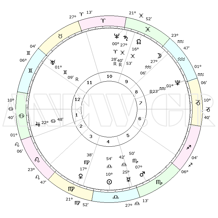 | ΘΕΣΕΙΣ ΠΛΑΝΗΤΩΝ ΑΣΤΡΟΛΟΓΙΚΟΥ ΧΑΡΤΗ ΤΗΣ ΣΤΙΓΜΗΣ ΑΥΤΗΣ | | Πλανήτης | Ζώδιο | Μοίρες | Δεκαήμ. | Σε οίκο | Απόκλιση | | Ακμές των οίκων | Ηλιος | Ζυγός | 10°50' | Δεύτερο | 5 | 04 S 17 | | 1ος | 14°39' | Δίδυμοι | Σελήνη | Υδροχόος | 26°03' | Τρίτο | 10 | 14 S 42 | | 2ος | 06°57' | Καρκίνος | Ερμής | Ζυγός | 25°35' | Τρίτο | 5 | 10 S 18 | | 3ος | 28°11' | Καρκίνος | Αφροδίτη | Παρθένος | 17°32' | Δεύτερο | 4 | 06 N 10 | | 4ος | 22°21' | Λέων | Αρης | Σκορπιός | 07°47' | Πρώτο | 6 | 14 S 12 | | 5ος | 23°31' | Παρθένος | Δίας | Καρκίνος | 22°48' | Τρίτο | 2 | 21 N 32 | | 6ος | 03°36' | Σκορπιός | Κρόνος | Ιχθείς | 27°41'R | Τρίτο | 11 | 03 S 14 | | 7ος | 14°39' | Τοξότης | Ουρανός | Δίδυμοι | 01°09'R | Πρώτο | 12 | 20 N 11 | | 8ος | 06°57' | Αιγόκερως | Ποσειδώνας | Κριός | 00°28'R | Πρώτο | 11 | 01 S 04 | | 9ος | 28°11' | Αιγόκερως | Πλούτωνας | Υδροχόος | 01°23'R | Πρώτο | 9 | 23 S 32 | | 10ος | 22°21' | Υδροχόος | Β. Δεσμός | Ιχθείς | 16°54' | Δεύτερο | 10 | 05 S 10 | | 11ος | 23°31' | Ιχθείς | Ωροσκόπος | Δίδυμοι | 14°39' | Δεύτερο | | | 12ος | 03°36' | Ταύρος | Μεσουράνημα | Υδροχόος | 22°21' | Τρίτο | | | |