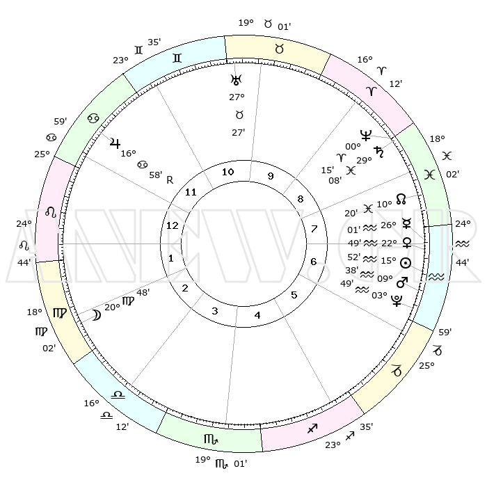 | | ΘΕΣΕΙΣ ΠΛΑΝΗΤΩΝ ΑΣΤΡΟΛΟΓΙΚΟΥ ΧΑΡΤΗ ΤΗΣ ΣΤΙΓΜΗΣ ΑΥΤΗΣ | | | | Πλανήτης | Ζώδιο | Μοίρες | Δεκαήμ. | Σε οίκο | Απόκλιση | | Ακμές των οίκων | | Ηλιος | Υδροχόος | 15°47' | Δεύτερο | 7 | 16 S 06 | | 1ος | 01°47' | Λέων | | Σελήνη | Παρθένος | 19°45' | Δεύτερο | 3 | 03 N 09 | | 2ος | 22°57' | Λέων | | Ερμής | Υδροχόος | 25°53' | Τρίτο | 8 | 14 S 24 | | 3ος | 18°14' | Παρθένος | | Αφροδίτη | Υδροχόος | 22°43' | Τρίτο | 7 | 15 S 16 | | 4ος | 19°29' | Ζυγός | | Αρης | Υδροχόος | 09°34' | Πρώτο | 7 | 18 S 52 | | 5ος | 25°29' | Σκορπιός | | Δίας | Καρκίνος | 16°58'R | Δεύτερο | 12 | 22 N 40 | | 6ος | 00°54' | Αιγόκερως | | Κρόνος | Ιχθείς | 29°07' | Τρίτο | 9 | 02 S 20 | | 7ος | 01°47' | Υδροχόος | | Ουρανός | Ταύρος | 27°27' | Τρίτο | 11 | 19 N 24 | | 8ος | 22°57' | Υδροχόος | | Ποσειδώνας | Κριός | 00°15' | Πρώτο | 9 | 01 S 06 | | 9ος | 18°14' | Ιχθείς | | Πλούτωνας | Υδροχόος | 03°49' | Πρώτο | 7 | 23 S 00 | | 10ος | 19°29' | Κριός | | Β. Δεσμός | Ιχθείς | 10°20' | Δεύτερο | 8 | 07 S 41 | | 11ος | 25°29' | Ταύρος | | Ωροσκόπος | Λέων | 01°47' | Πρώτο | | | 12ος | 00°54' | Καρκίνος | | Μεσουράνημα | Κριός | 19°29' | Δεύτερο | | | |