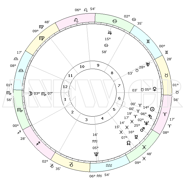 | | ΘΕΣΕΙΣ ΠΛΑΝΗΤΩΝ ΑΣΤΡΟΛΟΓΙΚΟΥ ΧΑΡΤΗ ΤΗΣ ΣΤΙΓΜΗΣ ΑΥΤΗΣ | | | | Πλανήτης | Ζώδιο | Μοίρες | Δεκαήμ. | Σε οίκο | Απόκλιση | | Ακμές των οίκων | | Ηλιος | Κριός | 13°56' | Δεύτερο | 7 | 05 N 30 | | 1ος | 11°37' | Ζυγός | | Σελήνη | Σκορπιός | 02°16' | Πρώτο | 1 | 16 S 10 | | 2ος | 08°58' | Σκορπιός | | Ερμής | Ιχθείς | 16°10' | Δεύτερο | 6 | 07 S 01 | | 3ος | 09°52' | Τοξότης | | Αφροδίτη | Ταύρος | 04°58' | Πρώτο | 7 | 12 N 52 | | 4ος | 13°06' | Αιγόκερως | | Αρης | Ιχθείς | 25°14' | Τρίτο | 6 | 02 S 51 | | 5ος | 16°02' | Υδροχόος | | Δίας | Καρκίνος | 15°58' | Δεύτερο | 10 | 22 N 51 | | 6ος | 15°58' | Ιχθείς | | Κρόνος | Κριός | 05°60' | Πρώτο | 6 | 00 N 25 | | 7ος | 11°37' | Κριός | | Ουρανός | Ταύρος | 28°53' | Τρίτο | 8 | 19 N 44 | | 8ος | 08°58' | Ταύρος | | Ποσειδώνας | Κριός | 02°19' | Πρώτο | 6 | 00 S 17 | | 9ος | 09°52' | Δίδυμοι | | Πλούτωνας | Υδροχόος | 05°16' | Πρώτο | 4 | 22 S 47 | | 10ος | 13°06' | Καρκίνος | | Β. Δεσμός | Ιχθείς | 07°16' | Πρώτο | 5 | 08 S 51 | | 11ος | 16°02' | Λέων | | Ωροσκόπος | Ζυγός | 11°37' | Δεύτερο | | | 12ος | 15°58' | Παρθένος | | Μεσουράνημα | Καρκίνος | 13°06' | Δεύτερο | | | |