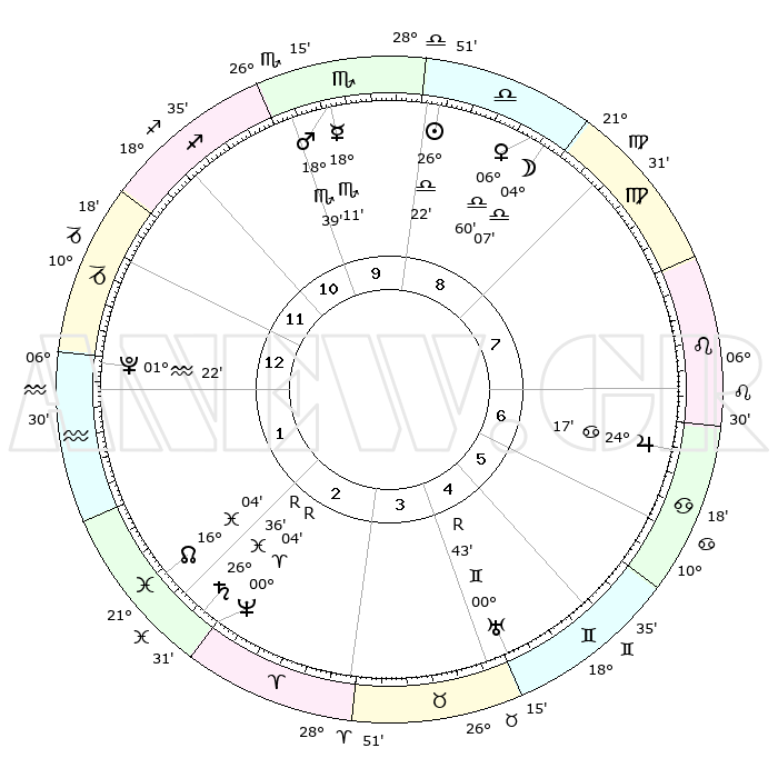 | ΘΕΣΕΙΣ ΠΛΑΝΗΤΩΝ ΑΣΤΡΟΛΟΓΙΚΟΥ ΧΑΡΤΗ ΤΗΣ ΣΤΙΓΜΗΣ ΑΥΤΗΣ | | Πλανήτης | Ζώδιο | Μοίρες | Δεκαήμ. | Σε οίκο | Απόκλιση | | Ακμές των οίκων | Ηλιος | Ζυγός | 26°16' | Τρίτο | 10 | 10 S 08 | | 1ος | 01°29' | Αιγόκερως | Σελήνη | Ζυγός | 03°01' | Πρώτο | 9 | 02 S 26 | | 2ος | 09°00' | Υδροχόος | Ερμής | Σκορπιός | 18°03' | Δεύτερο | 10 | 19 S 18 | | 3ος | 19°06' | Ιχθείς | Αφροδίτη | Ζυγός | 06°53' | Πρώτο | 9 | 01 S 19 | | 4ος | 22°48' | Κριός | Αρης | Σκορπιός | 18°35' | Δεύτερο | 10 | 17 S 37 | | 5ος | 18°53' | Ταύρος | Δίας | Καρκίνος | 24°17' | Τρίτο | 7 | 21 N 19 | | 6ος | 10°36' | Δίδυμοι | Κρόνος | Ιχθείς | 26°36'R | Τρίτο | 3 | 03 S 38 | | 7ος | 01°29' | Καρκίνος | Ουρανός | Δίδυμοι | 00°43'R | Πρώτο | 5 | 20 N 05 | | 8ος | 09°00' | Λέων | Ποσειδώνας | Κριός | 00°04'R | Πρώτο | 3 | 01 S 14 | | 9ος | 19°06' | Παρθένος | Πλούτωνας | Υδροχόος | 01°22' | Πρώτο | 1 | 23 S 32 | | 10ος | 22°48' | Ζυγός | Β. Δεσμός | Ιχθείς | 16°04' | Δεύτερο | 2 | 05 S 30 | | 11ος | 18°53' | Σκορπιός | Ωροσκόπος | Αιγόκερως | 01°29' | Πρώτο | | | 12ος | 10°36' | Τοξότης | Μεσουράνημα | Ζυγός | 22°48' | Τρίτο | | | |